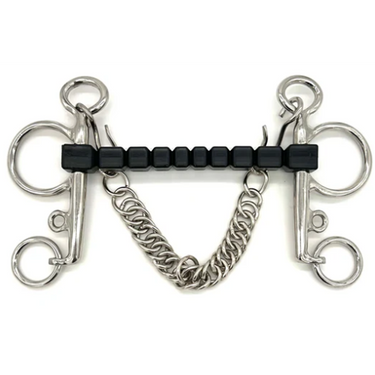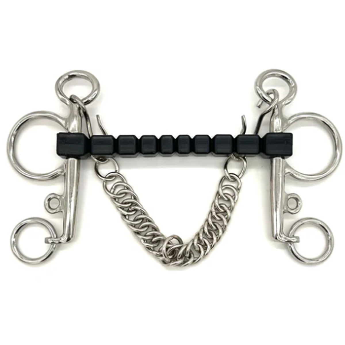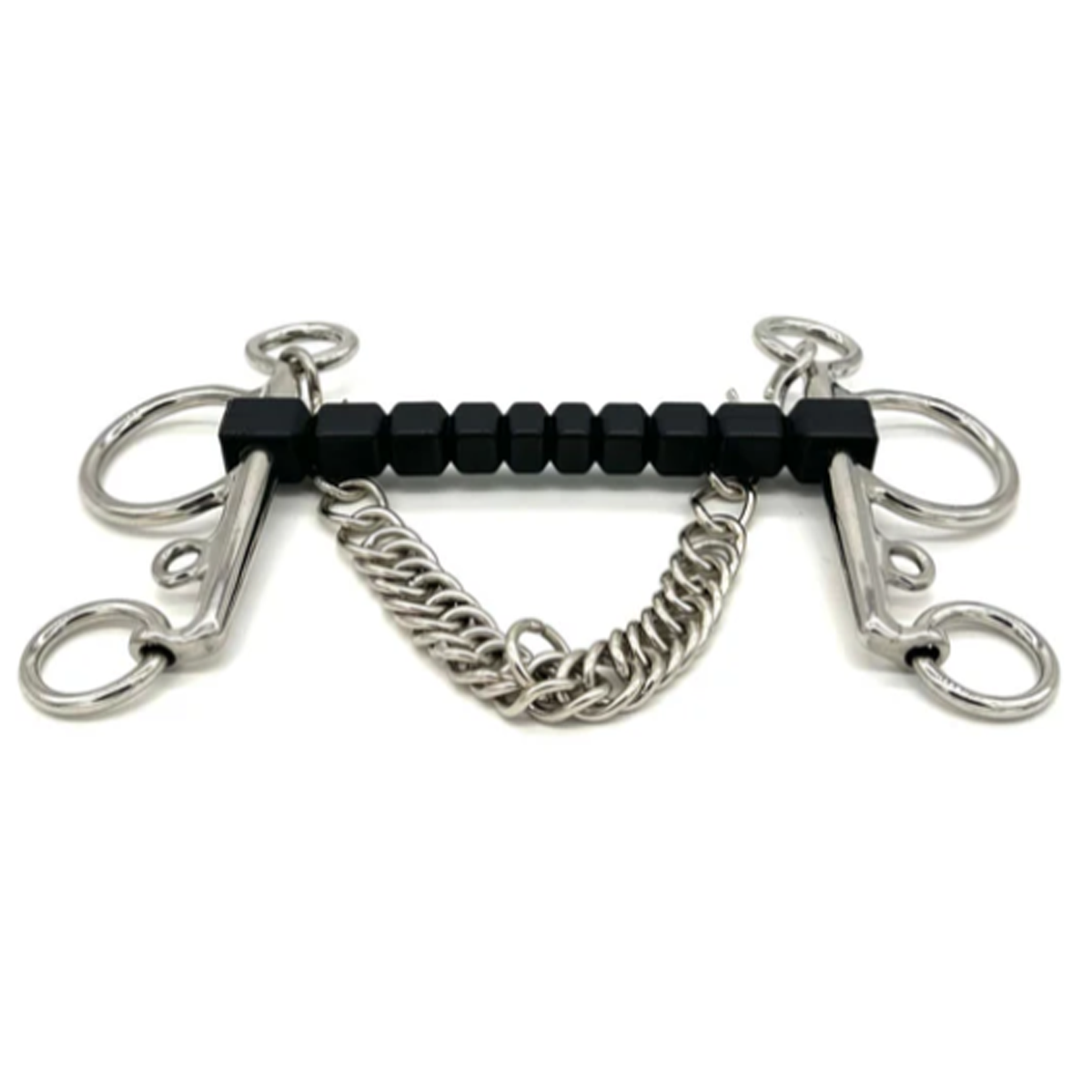 The bit features a rubber block mouthpiece designed to cover a broad surface area in the horse’s mouth, effectively reducing the tendency to fix or lean, encouraging a more balanced and responsive engagement. The tapered structure of the mouthpiece, with blocks that gradually decrease in size, ensures additional tongue space, reducing pressure and improving the horse’s comfort and acceptance of the bit.