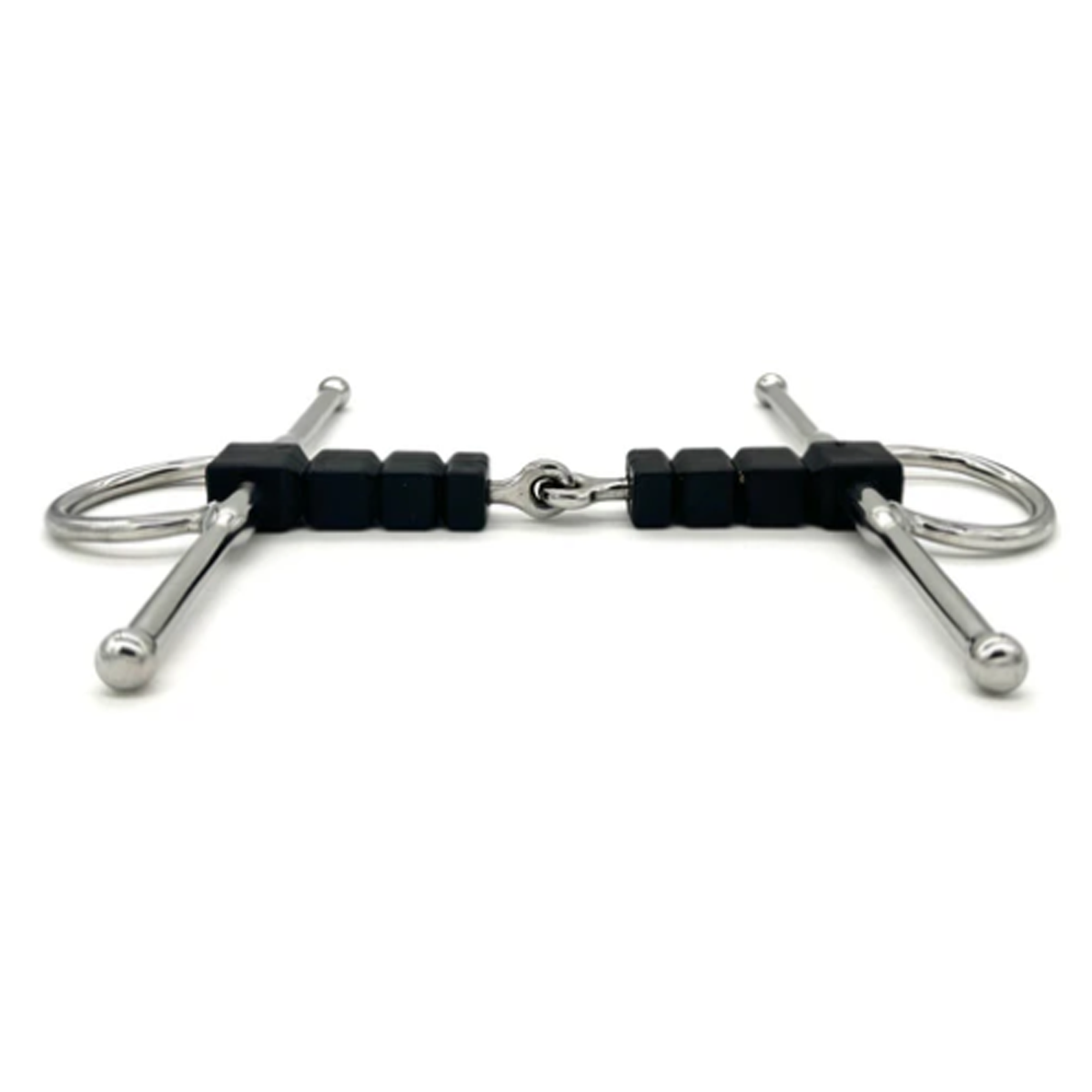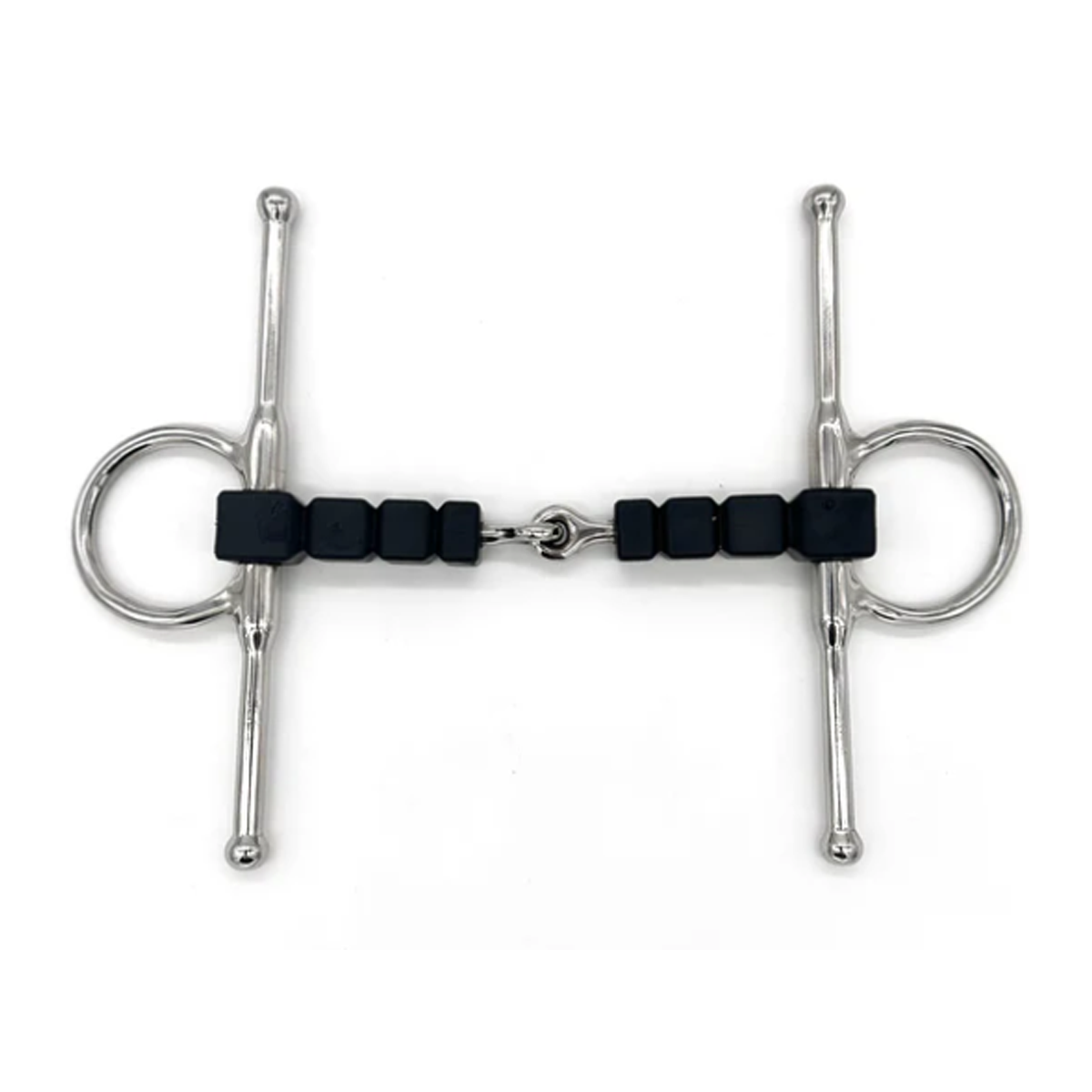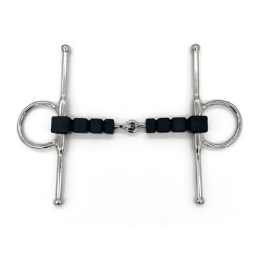 The Rubber Block Full Cheek bit was designed to discourage fixing and leaning on the forehand. This softer version of our traditional stainless steel block model encourages suppleness and responsiveness. The Full Cheek design assists with steering and turning. When the reins are engaged, the rubber blocks apply pressure to the bars of the mouth which advises the horse to lift the balance and soften their mouth.