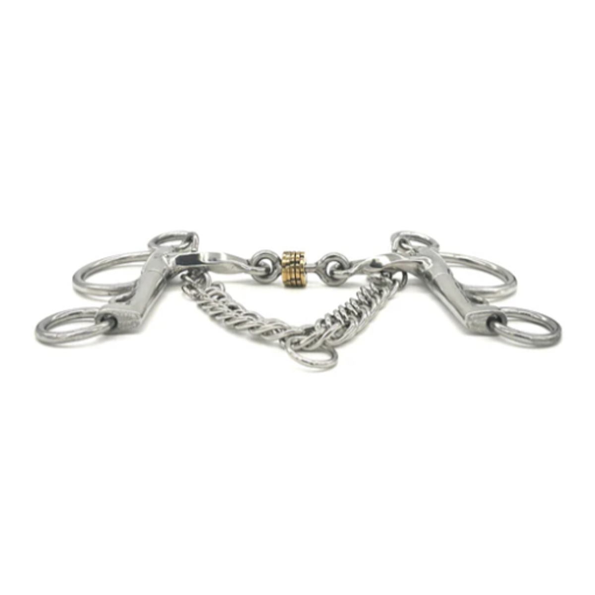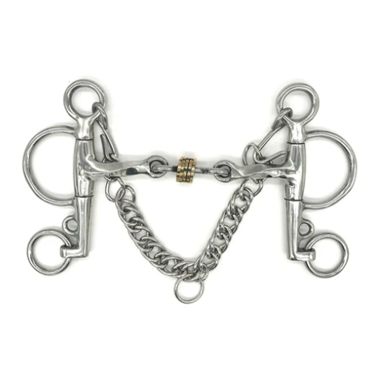 Particularly beneficial for horses that respond well to a twisted bit, the Twisted Brass Disc Pelham Bit aids in achieving desired head positioning and responsiveness. The curb chain component of the Pelham applies gentle pressure to the poll and chin groove, offering additional control.