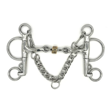 The Twisted Brass Disc Pelham Bit is a versatile choice for riders seeking a balance of control and comfort for their horse. This unique Pelham bit combines the functionality of both a snaffle and a curb bit, featuring a twisted mouthpiece with brass disc accents. The brass discs provide an engaging element for the horse, encouraging playfulness which can lead to relaxation and ease during riding.