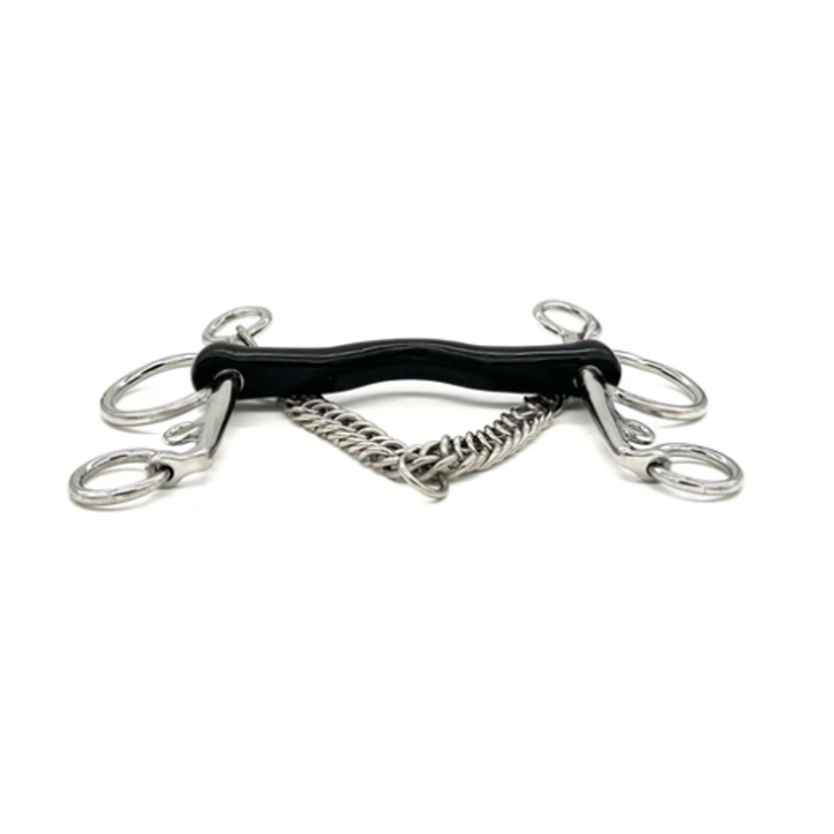 The Vulcanite Port Pelham Bit, known for its vulcanized rubber composition is reinforced with a steel core proving to be both durable and reliable. The Vulcanized rubber, also known as Bakelite is a material strengthened through the vulcanization process and provides resilience, ensuring the bit withstands the rigors of regular use.