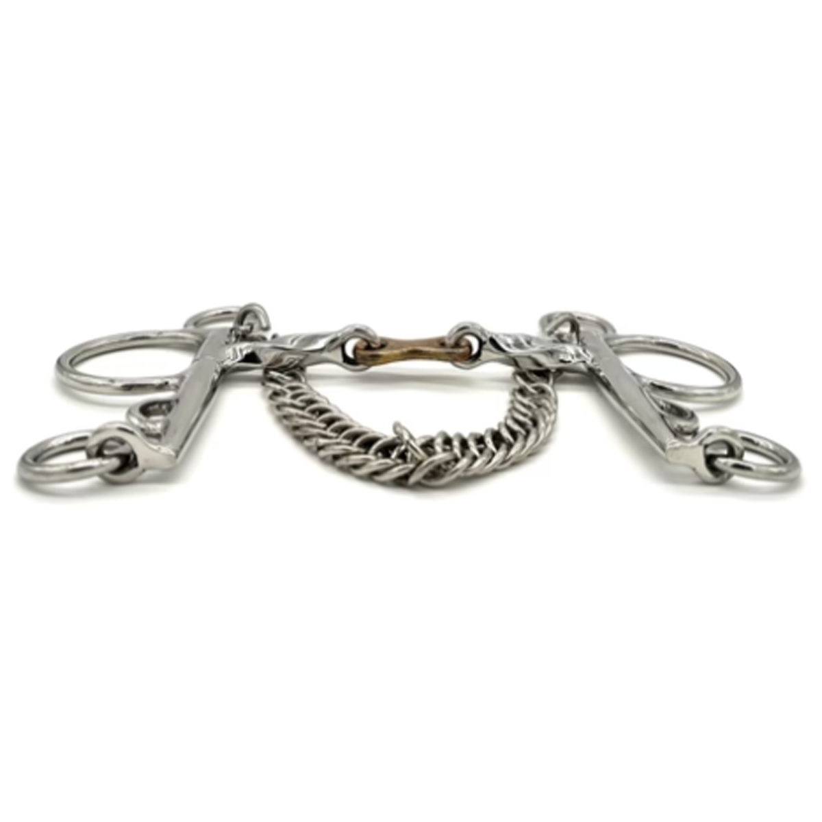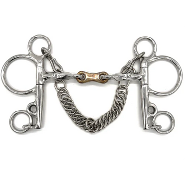 This beautifully crafted bit features a three pieces including a Copper French Link. The French link provides additional comfort for sensitive horses. The pelham cheek piece offers the rider additional leverage and control. The Copper French Link encourages salivation and encourages the horse to accept the bit. The double-jointed mouthpiece avoids the nutcracker action of a single joint, preventing the bit from hitting the roof of the mouth and gives the rider independent control over each side of the mouth.