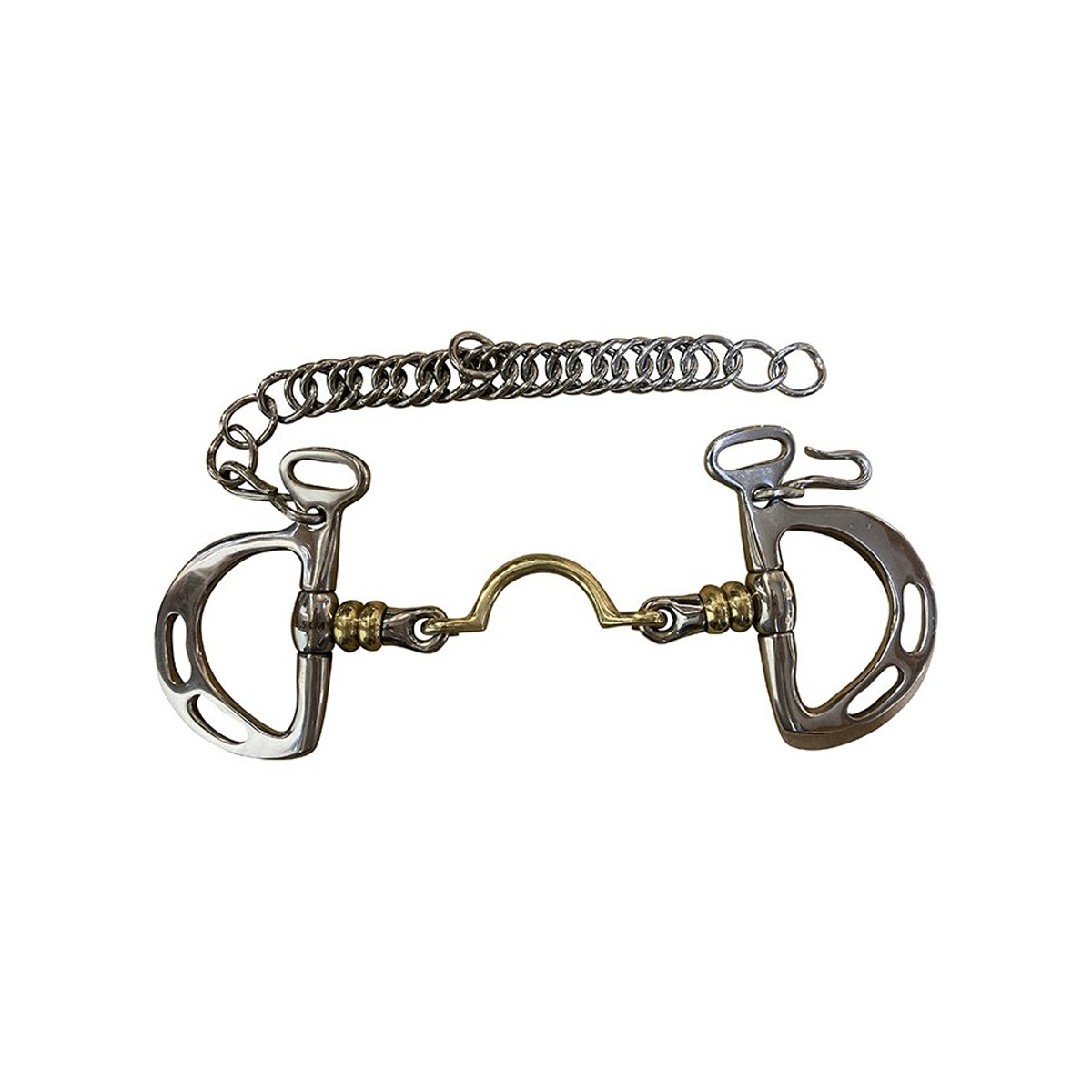 Effect: the Goyo Aga bit has a more or less strong lowering effect depending on where on the ring the rein is fixed and also depending on how the curb chain is tightened. The high port frees the roof of the mouth from any pressure and is more ergonomic. The rollers help relaxing the horse.