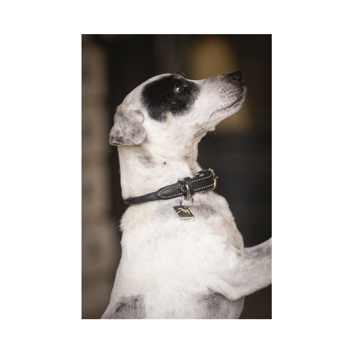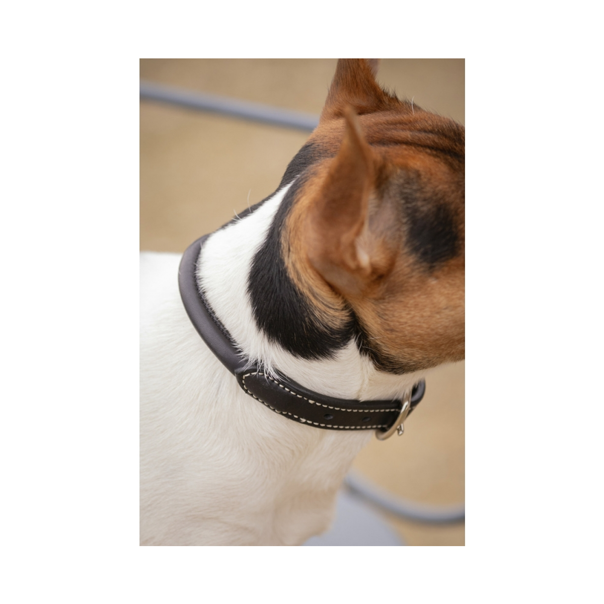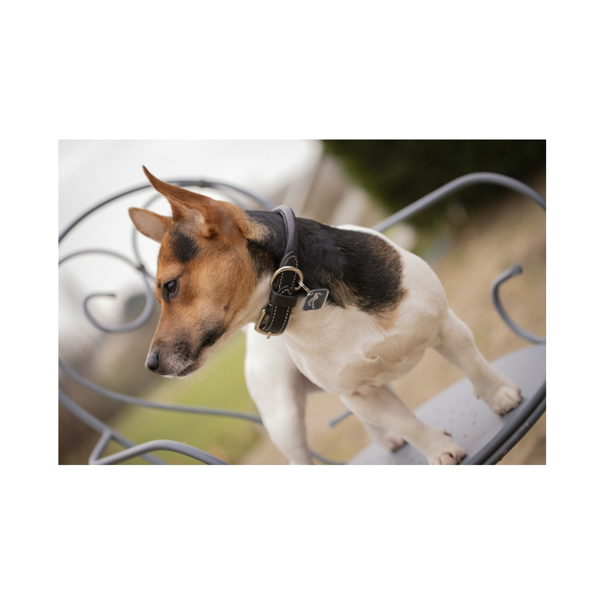 The charming Olie leather dog collar features a round design. With four available sizes, it fits various neck circumferences. It fastens with a buckle and carries a lovely medal engraved with the Pénélope logo. Its minimalist look makes it easy to pair with different leash models.