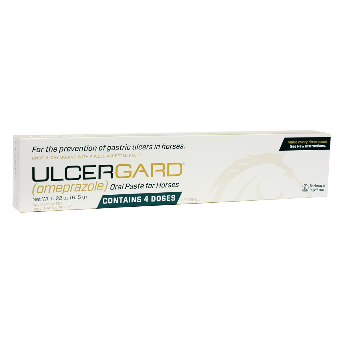 Some horses are more prone to stress than others, but for many, even small changes in routine can potentially lead to gastric ulcers. Stomach ulcers in horses are more common than once believed. Studies have demonstrated stomach ulcers in over 90% of racehorses and around 60% of performance horses in various disciplines*. Before stress has a chance to cause gastric ulcers, use UlcerGard. Deliver targeted, effective medication during anticipated stressful times, such as traveling, competition, stall confinement and strenuous exercise. This allows for proven prevention of gastric ulcers in otherwise healthy horses who are at risk due to increased stress. UlcerGard is the only ulcer medication for horses proven to be safe and effective and approved by the FDA to prevent equine ulcers. Specially formulated to survive the acidic stomach environment allowing proper absorption. Blocks acid production at the proton pump regardless of stimuli.