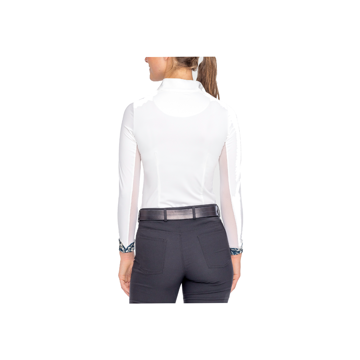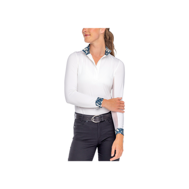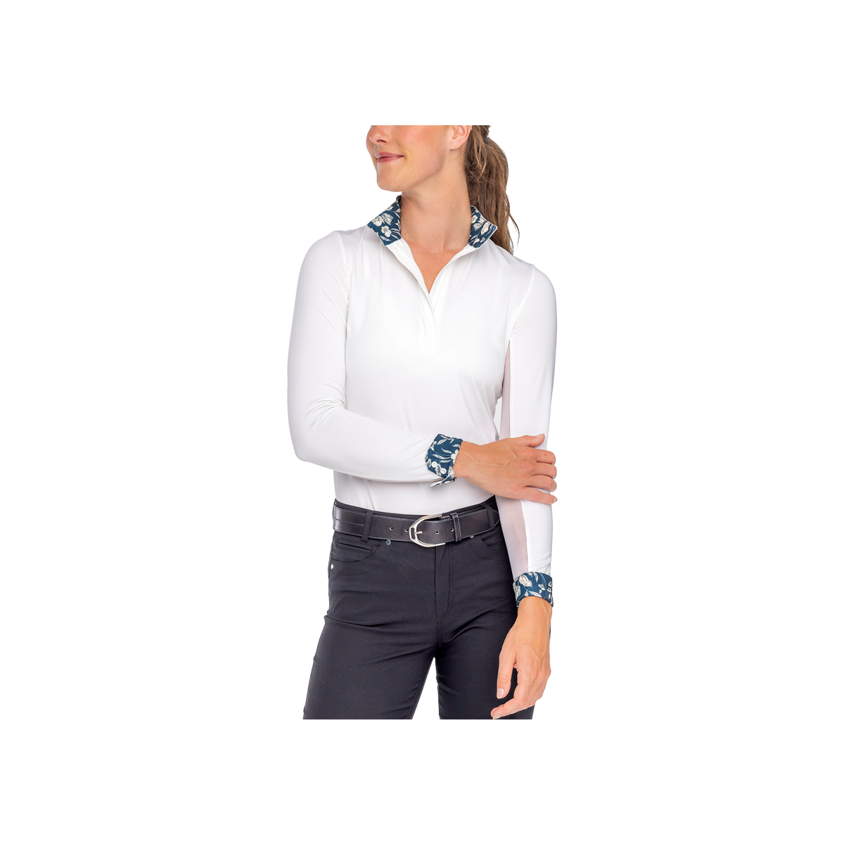 This season’s white tailored shirt features the sailor blue French tulip print in the inner collar and cuffs. Snap closure at the neck and cuffs, tailored darts at chest and back. UPF 50.