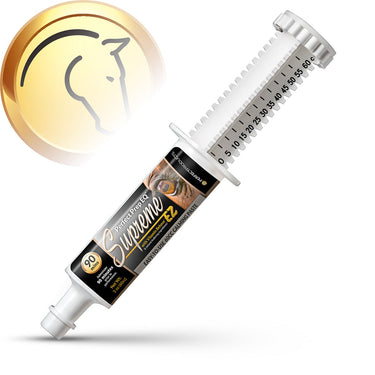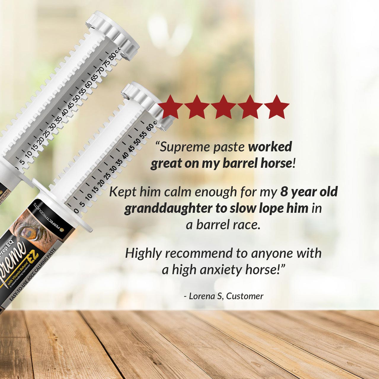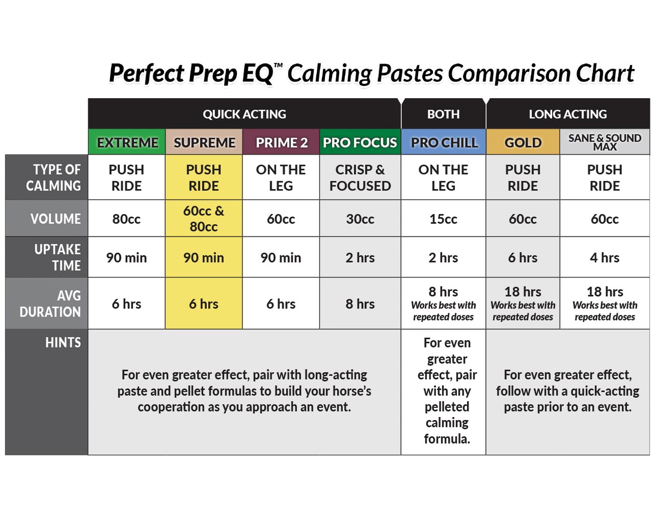 Similar a Extreme, Perfect Prep EQ Supreme es un suplemento calmante para caballos de acción rápida y específico con vitamina BeHave que crea un efecto calmante aún mayor. Úselo 90 minutos antes de que aumente el estrés. Los efectos comienzan en 1 hora y duran hasta 6 horas. 80 cc de ingredientes activos específicos, líder en la industria. Puede usarse solo o como parte del sistema calmante Perfect Prep