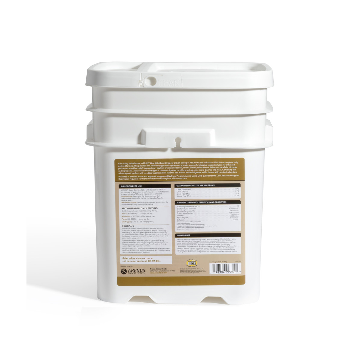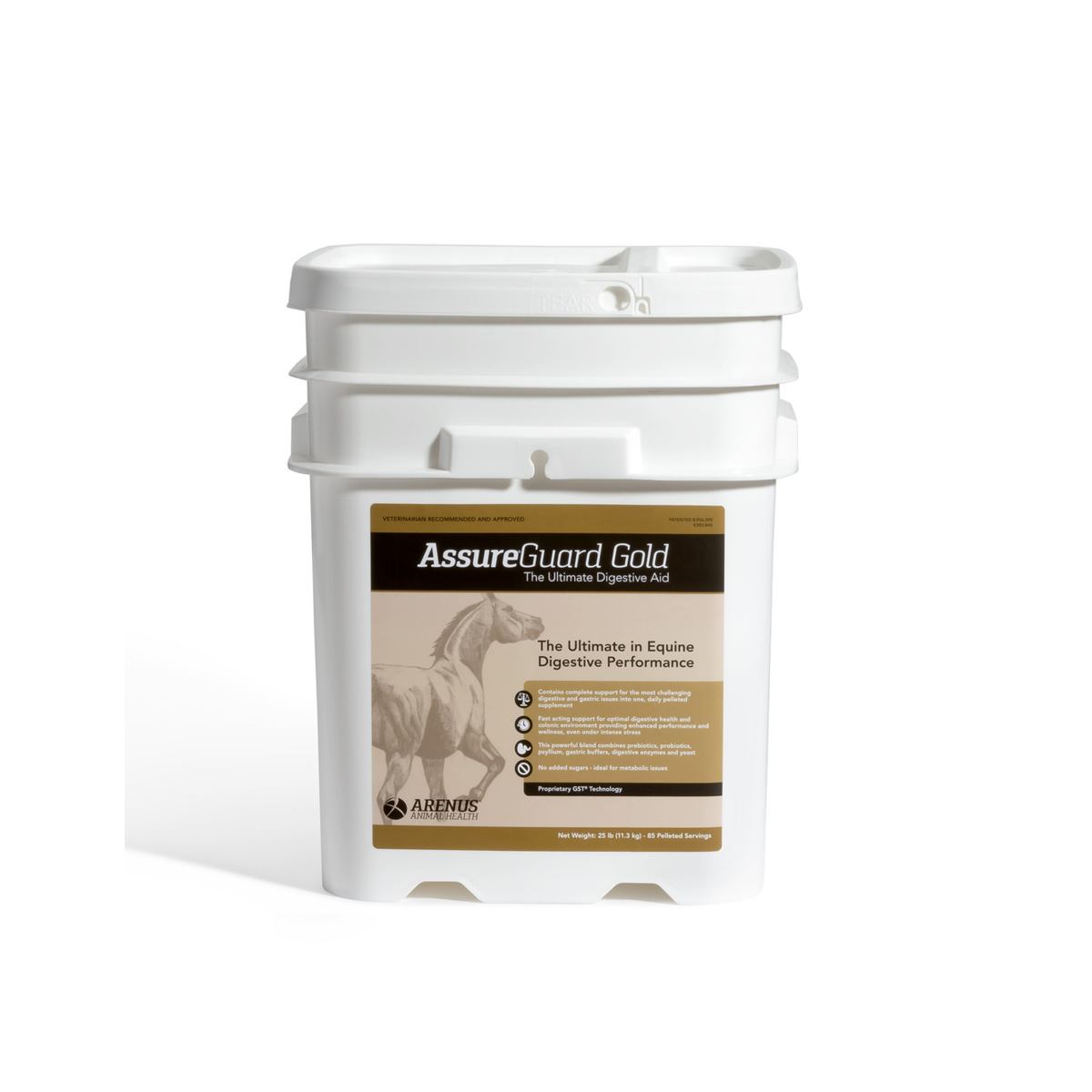 ASSURE GUARD GOLD: LA ÚLTIMA AYUDA DIGESTIVA PARA EQUINOS De acción rápida y eficaz, Assure Guard Gold combina la combinación probada de Assure Guard y Assure Plus en una fórmula completa en gránulos diaria. ¿Problemas digestivos crónicos? ¿Intestino permeable? ¿Mala condición corporal? ¿Busca mejorar el bienestar general o el rendimiento de su caballo? No busque más que Assure Guard Gold: la ayuda digestiva máxima para equinos. Entre el 60 y el 70 por ciento de la función inmunológica de un caballo proviene de la salud digestiva. Los caballos que luchan con problemas digestivos agudos o crónicos sufren un bienestar general deficiente, una disminución del rendimiento y un malestar continuo. El exigente estilo de vida de los atletas equinos los hace susceptibles a una amplia gama de problemas digestivos. Assure Guard Gold es la única solución completa para las necesidades diarias de apoyo digestivo y de bienestar de su caballo. Ayuda a mantener un sistema digestivo saludable para todo tipo de caballos, incluidos los de rendimiento. Sin azúcares añadidos, Assure Guard Gold es el suplemento digestivo y para úlceras equinas de elección para caballos con síndrome metabólico equino. Las investigaciones han demostrado que agregar psyllium de alta calidad a la dieta diaria de un caballo puede ayudar a reducir la glucosa en sangre y la concentración de insulina. ELIJA LA OPCIÓN ASSURE ADECUADA PARA SU CABALLO Assure Guard Gold es la opción correcta para: Caballos en entrenamiento, competencia o entornos de alto estrés que necesitan alivio rápido. Caballos que sufren úlceras crónicas, cólicos, diarrea, acumulación de arena y otros problemas digestivos. Caballos con problemas metabólicos como Cushing, resistencia a la insulina o síndrome metabólico equino. Caballos que sufren o están en riesgo de tener intestino permeable, acción o ruptura de la barrera del intestino posterior. Intestino permeable la causa subyacente de los problemas de salud digestiva y los trastornos metabólicos. Propietarios que están listos para una solución todo en uno para la salud digestiva de cualquier caballo. BENEFICIOS CLAVE Alivio rápido de las dolencias digestivas: Assure Guard Gold tiene un efecto poderoso y brinda un alivio digestivo rápido. Muchos propietarios ven resultados en tan solo una semana. Rendimiento y bienestar mejorados: no sabrá cuánto de su caballo ha perdido debido a problemas de salud digestiva hasta que haya abordado el problema. Tener un sistema digestivo tranquilo y feliz mantiene a su caballo en la cima de su juego. Apoyo digestivo total: Assure Guard Gold trabaja para apoyar todo el tracto digestivo desde el estómago hasta el intestino posterior. Puede confiar en que la salud digestiva total de su caballo está siendo apoyada para un funcionamiento óptimo. Ayuda digestiva todo en uno: un solo ingrediente no solucionará el sistema digestivo de un caballo. Se necesita la combinación adecuada para garantizar una salud digestiva adecuada. Assure Guard Gold combina nuestra combinación probada de Assure Guard y Assure Plus en una ayuda digestiva todo en uno. Es el único producto en el mercado que combina los ingredientes de calidad necesarios para una solución diaria completa. CARACTERÍSTICAS La fórmula probada por la investigación ofrece un sistema de administración único que es incomparable con cualquier otro suplemento digestivo o para úlceras en el mercado. Los ingredientes actúan para fortalecer el intestino grueso y brindar el máximo apoyo a la salud digestiva. Proceso patentado de psyllium: el psyllium mantiene el tracto digestivo de su caballo limpio y saludable. Pero la mayoría de los productos de psyllium están altamente procesados utilizando un método de vapor de alta temperatura de inferior calidad. Arenus utiliza psyllium en su forma original, en escamas, y hace uso de un proceso de granulado patentado. Esto garantiza que el psyllium se mantenga en la forma correcta para brindar los máximos beneficios al intestino grueso. Sistema de administración patentado: administra una dosis más alta de microbios al intestino grueso que cualquier otro producto del mercado con gránulos especiales con recubrimiento entérico. Potente combinación de ingredientes: contiene una mezcla única de pre y probióticos, psyllium, tampón gástrico, enzimas digestivas, levadura y carbonato de calcio para restablecer el equilibrio del tracto digestivo y prevenir futuros problemas digestivos. Acción reconstituyente: los medicamentos típicos para las úlceras pueden ralentizar la producción de ácido y hacer que las enzimas digestivas naturales mueran. Esto puede permitir que los alimentos no digeridos se desplacen a través del tracto digestivo, lo que provoca úlceras en el intestino grueso o perpetúa la aparición de úlceras gástricas. Añadir un suplemento de calidad para úlceras como Assure Guard Gold puede garantizar que el tracto digestivo de su caballo se reponga constantemente de microbios y mantenga una función óptima. Sistema seguro y sencillo: establezca y olvídese de su protocolo de salud digestiva. Una vez que se haya ocupado del problema digestivo de su caballo, puede seguir usando Assure Guard Gold para un mantenimiento diario eficaz. Fórmula clínicamente probada: se ha demostrado que la fórmula respaldada por investigaciones y aprobada por veterinarios alivia las úlceras, los cólicos, la diarrea, la pérdida de peso y más. Los veterinarios recomiendan Assure Guard Gold con mayor frecuencia para sus casos de salud digestiva más desafiantes. Butirato: el ácido butírico, también conocido como butirato, es un ácido graso volátil (AGV) crítico que se produce en el intestino grueso de todos los caballos. El psyllium de alta calidad y alta pureza en Assure Guard Gold se somete a un procesamiento especial para crear gránulos concentrados y potentes que aumentan de forma natural y eficaz la producción de butirato. 