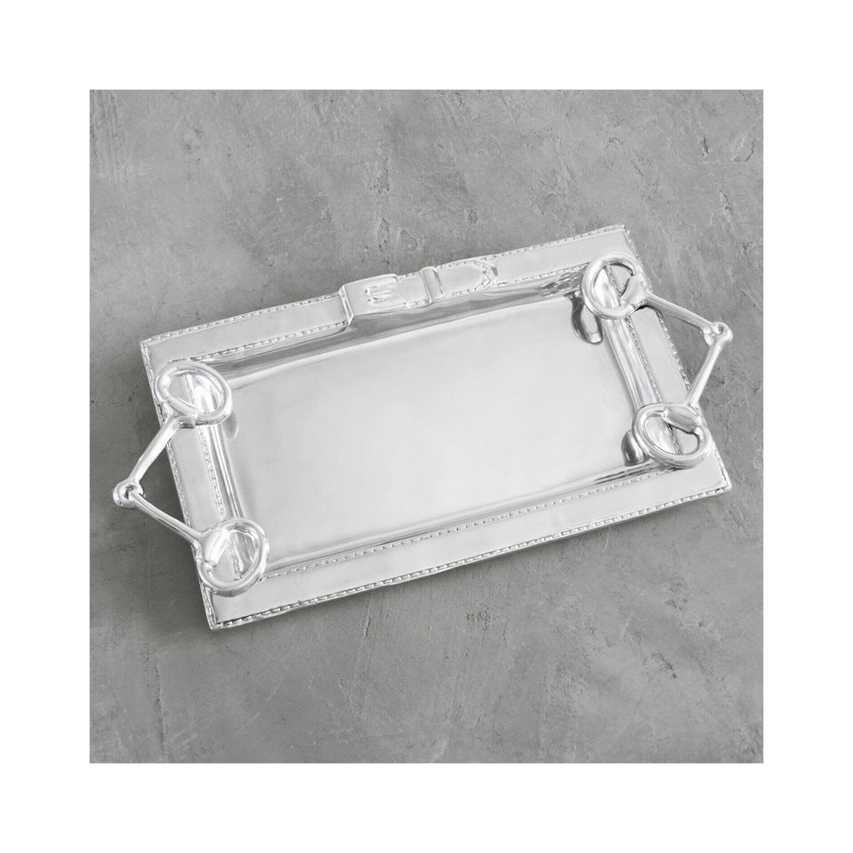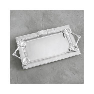 Nuestra bandeja ecuestre larga (lg) tiene proporciones elegantes y está equipada con detalles de aparejos que seguramente deleitarán a los amantes de los caballos. Su sofisticado estilo ecuestre agrega clase a cualquier entorno. Ideal para pasar julepes de menta en las fiestas del Derby de Kentucky. Fabricada con una aleación de aluminio al 93 % de fácil cuidado y segura para la FDA. 19 ¾ x 9 ¾ x 1 1/4