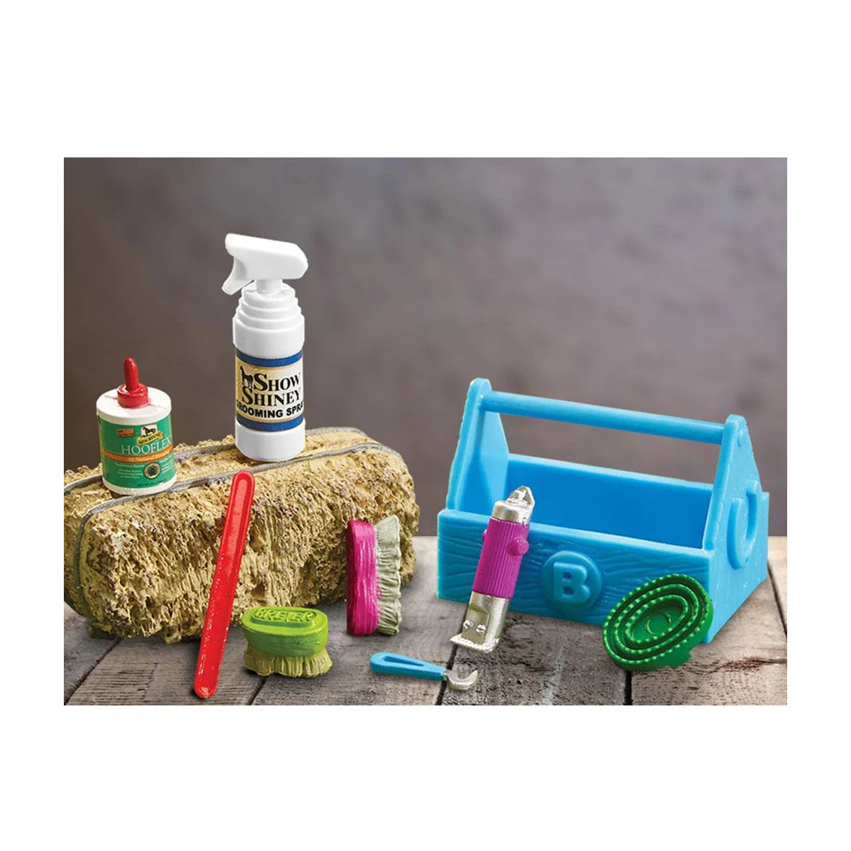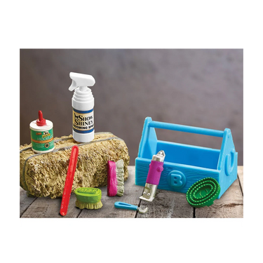 ¡Todo lo que necesitas para preparar a un caballo! Incluye bolsa de aseo, limpiacascos, recipiente para aceite de cascos, cepillo de cerdas, cepillo facial, raspador de sudor, máquina eléctrica, peine de almohaza y botella rociadora. Caballo no incluido.