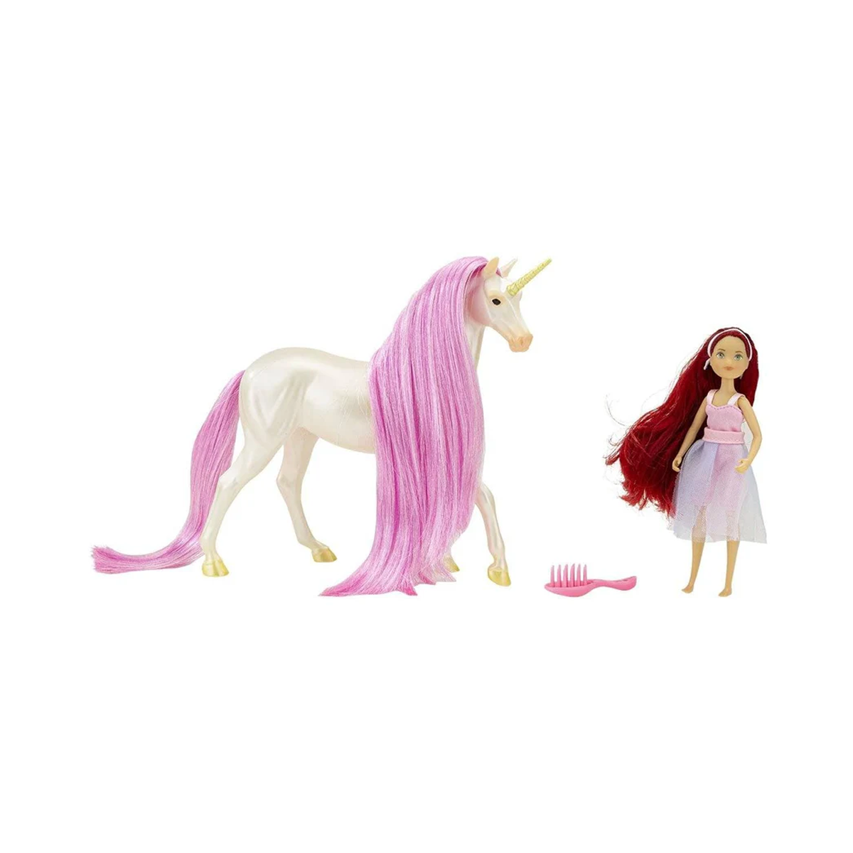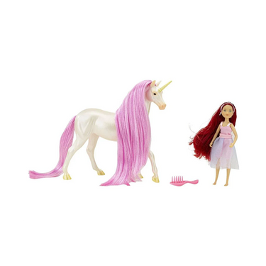 Sky, un unicornio mágico, es una criatura blanca brillante con una melena y una cola rosadas de dos tonos que se pueden cepillar: una verdadera belleza. Sky está acompañada por su amiga Meadow, una jinete articulada de 5,75" vestida con un atuendo inspirado en la fantasía. ¡Un nuevo y emocionante set de regalo que a tu fanático de los unicornios le encantará mientras disfruta pasando el tiempo peinando la melena y la cola de Sky con el cepillo incluido!