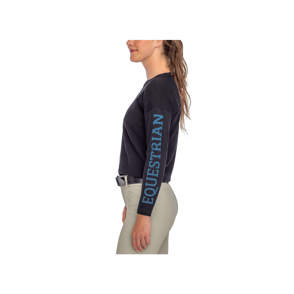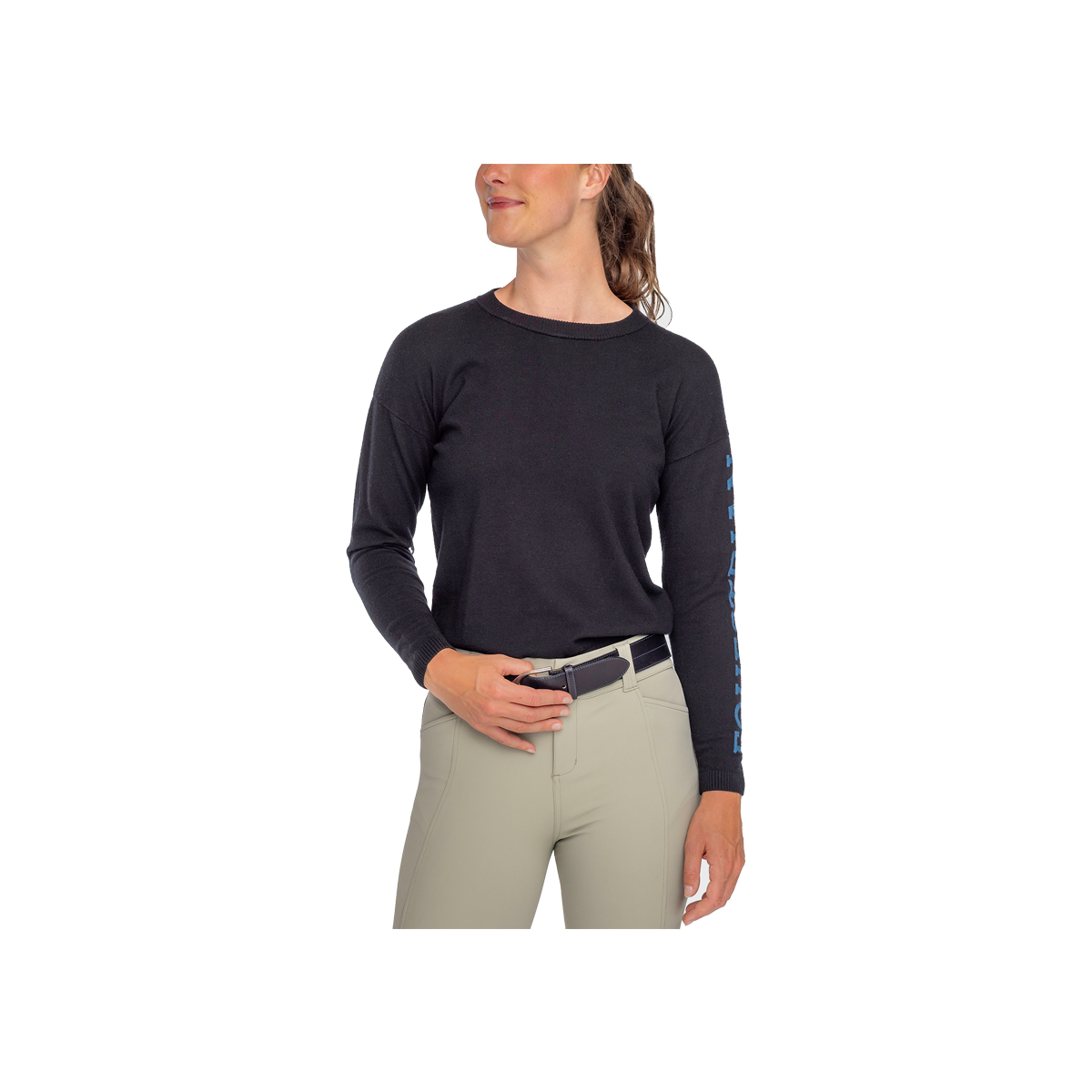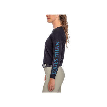 Kastel's super soft, drop shoulder seam crewneck medium weight sweater in sleek black features "Equestrian" in rich sailor blue down the left sleeve. Worn as a layering piece over your favorite 1/4 zip or by itself, this is your next cozy go-to piece.
