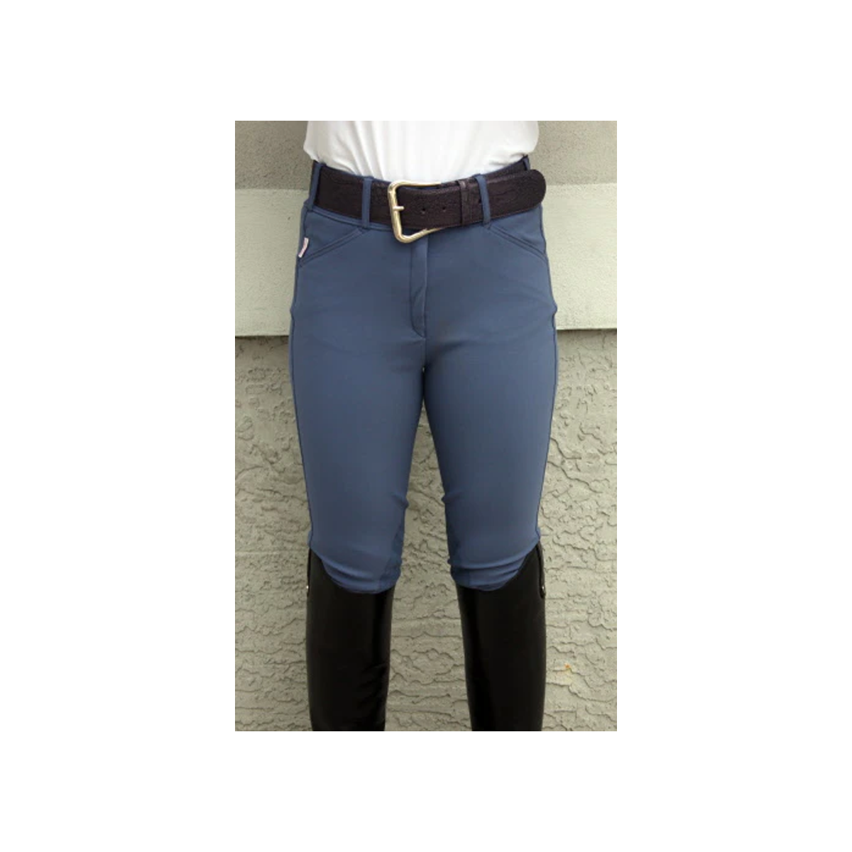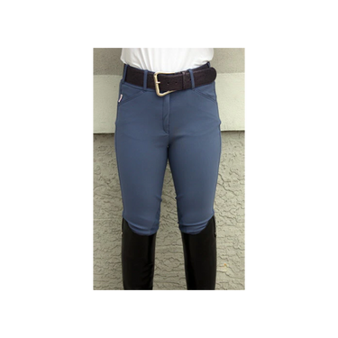Tiro medio, cierre frontal con cremallera, velcro en la parte inferior. Tejido elástico en cuatro direcciones, confeccionado con una mezcla de algodón y licra, parche de Clarino en la rodilla.