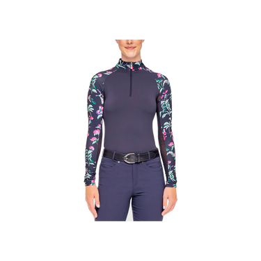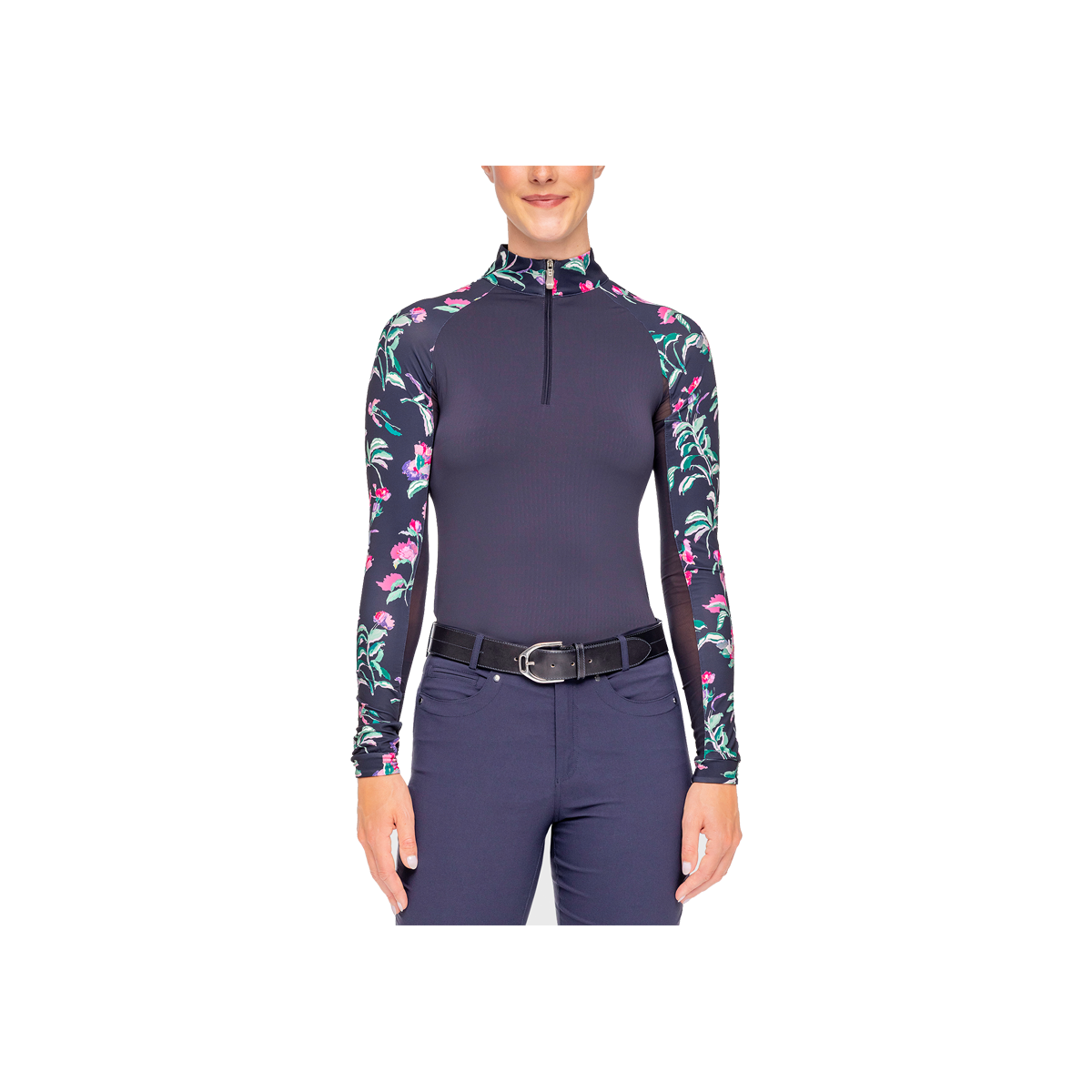 The garden bloom print features beautiful pinks, lush greens with a classic navy ground. Printed sleeves pair with flattering classic navy bodice. Perfect for lengthy days in the saddle, on the green, hiking, pickleball and beyond. Long sleeves, breathable power mesh, 1/4 zip, UPF 30 and soft 4-way stretch fabric in a contemporary fit.