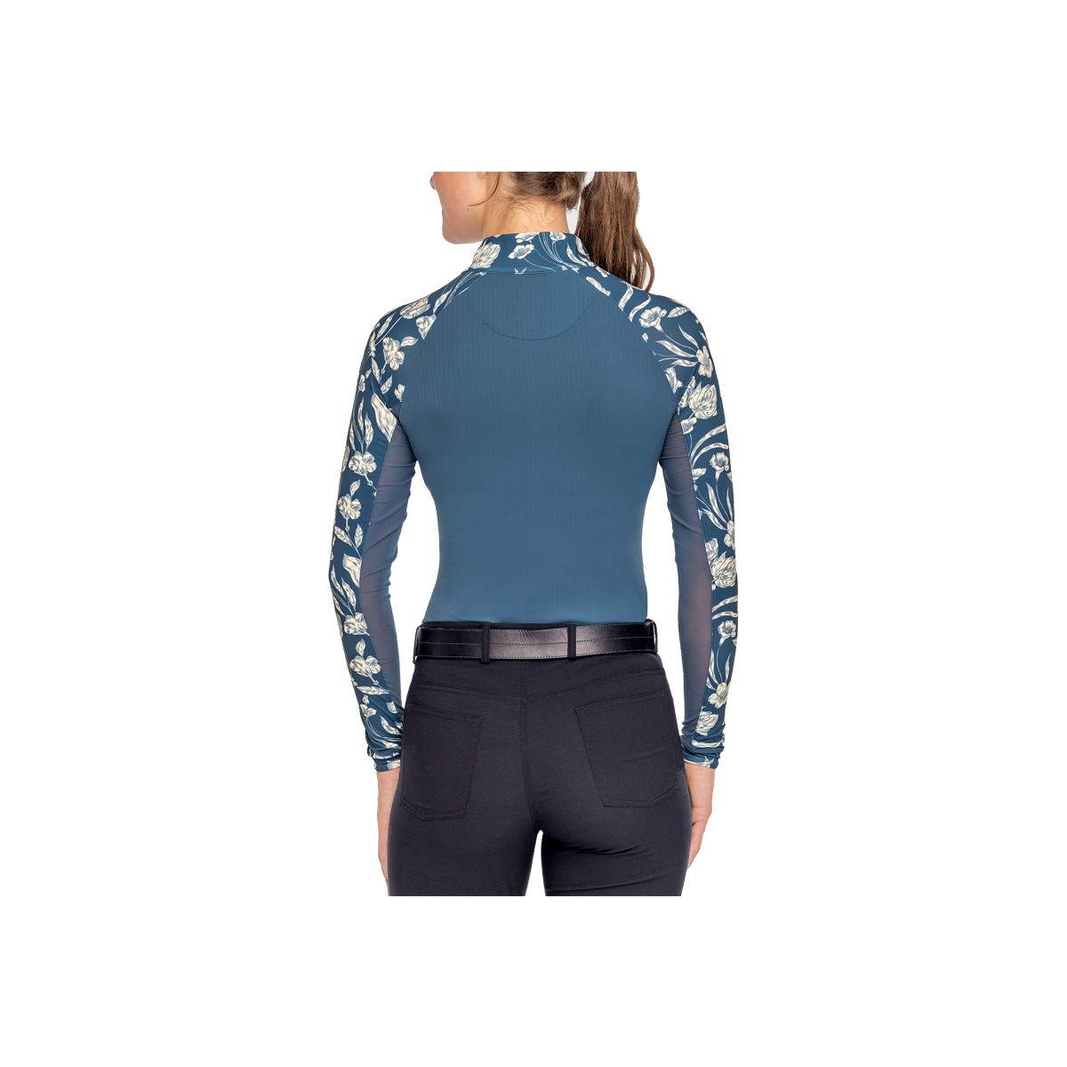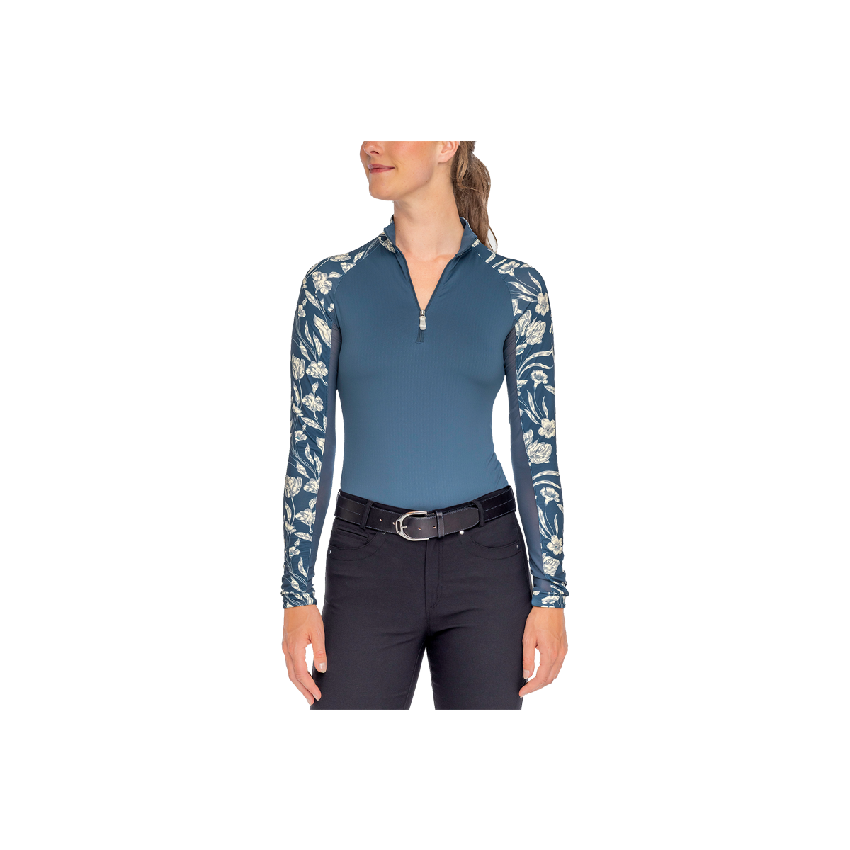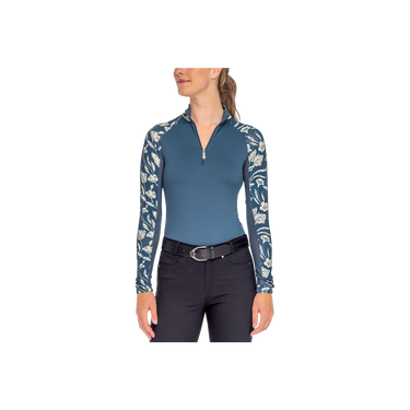 This sporty silhouette features the feminine French tulip print paired with contemporary rich blue bodice. Long sleeves, ¼ zip, UPF 30, breathable power mesh and soft 4-way stretch fabric in a contemporary fit.