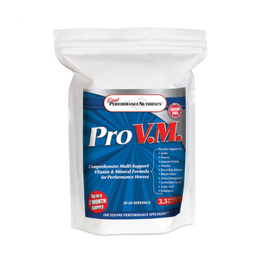 Fórmula concentrada profesional multiuso de vitaminas, minerales y aminoácidos para caballos de carreras. La fórmula integral de Pro VM proporciona ingredientes para: • Apoyo a las articulaciones y al tejido conectivo • Apoyo al sistema inmunológico • Gestión de la actitud • Resistencia • Rendimiento • Apoyo muscular • Electrolitos • Apoyo para los cascos Los caballos de carreras tienen mayores necesidades nutricionales que no siempre se pueden cubrir solo con la alimentación. El ejercicio constante de alta intensidad exige mucho de las articulaciones, el sistema inmunológico y el sistema muscular del caballo. Sin los ingredientes de Pro VM®, su caballo podría tener deficiencia de varias vitaminas y minerales, lo que podría reducir el rendimiento, la salud y la actitud. Pro VM está específicamente formulado para caballos de carreras al incluir la cantidad dietética más alta recomendada de cada nutriente; nutrientes que se agotan con el ejercicio intenso. Pro VM también proporciona nutrientes para apoyar problemas comunes en los caballos de carreras, como ataduras, desequilibrio electrolítico que puede ser causado por Lasix®, golpes, problemas en las articulaciones y capilares pulmonares frágiles que pueden estallar bajo los extremos de las carreras.