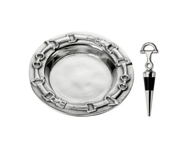 Completa tu colección ecuestre con este juego de posavasos y tapón para vino de Arthur Court. Nuestro diseño característico de bocado y correa rodea el posavasos, mientras que otro bocado se encuentra verticalmente sobre el tapón. Muestra tu amor por la equitación al incluir este juego de aluminio hecho a mano en tu vajilla. Un gran regalo para los amantes de los caballos y el vino. Posavasos: 6" de diámetro Tapón: 5-1/2" de largo