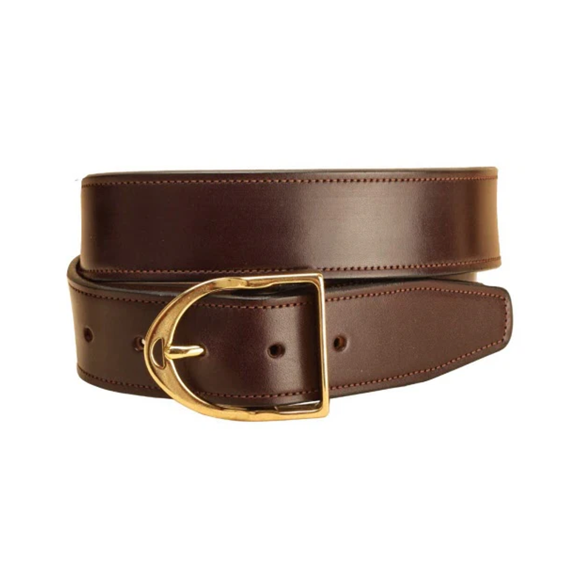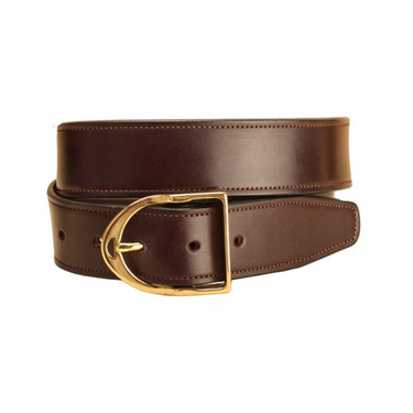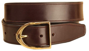Cinturón de cuero cosido con brida de 1-1/2” con hebilla de estribo inglesa diseñada para funcionar como hebilla y pasador. La hebilla está remachada, por lo que no se puede cambiar.