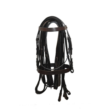 Brida Pelham completa con bocado de cuero, 2 riendas rectas, martingala y pechera de doble ajuste. Puedes convertirla en una brida de mordaza quitando las carrilleras y comprando una muserola baja (artículo n.° T20109A). Bocado no incluido.