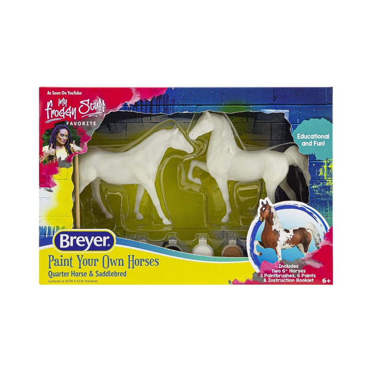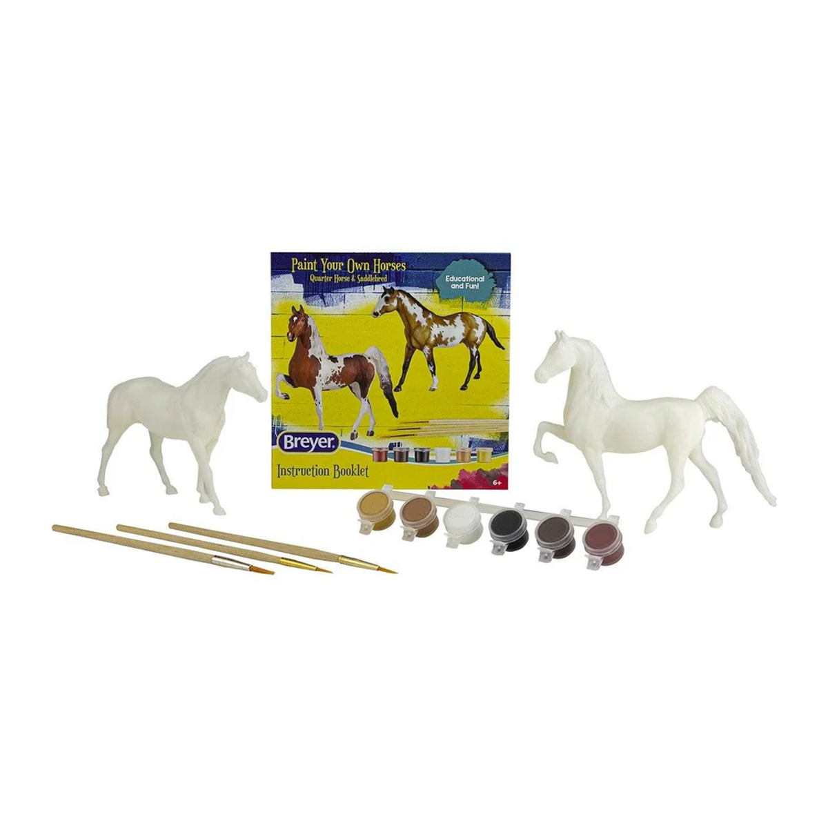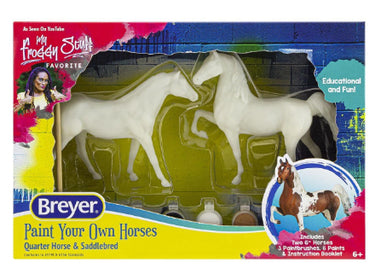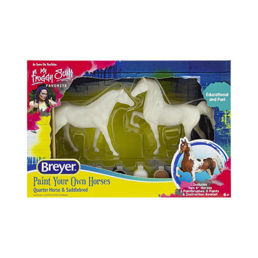 Pinturas, pinceles y un folleto detallado con instrucciones para pintar estos dos caballos de 6" para que se parezcan a tu caballo favorito. ¡Todo lo que se necesita es el toque de un joven artista! El folleto de instrucciones a todo color muestra los colores del pelaje, los detalles de los ojos y los cascos, las marcas de la cara y las patas y mucho más. Incluye dos caballos de 6", 3 pinceles, 6 botes de pintura y un folleto de instrucciones a todo color. ¡Arremángate, ponte la "camiseta de pintura" y crea tus propios y hermosos modelos!