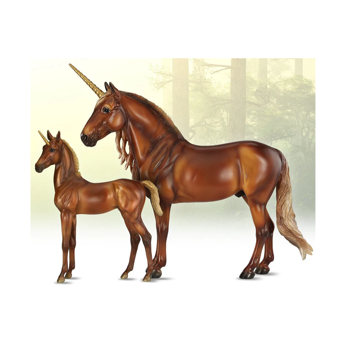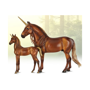 El orgulloso semental Cyrus y su valiente potra Solana son los unicornios más nuevos en sumarse a la línea tradicional. Esta adorable pareja luce un pelaje castaño dorado oscuro a juego con un sombreado intenso, lo que los hace parecer besados por la luz del sol. Sus crines y colas rubias complementan maravillosamente sus pelajes, y sus pezuñas y cuernos dorados completan su apariencia mítica.