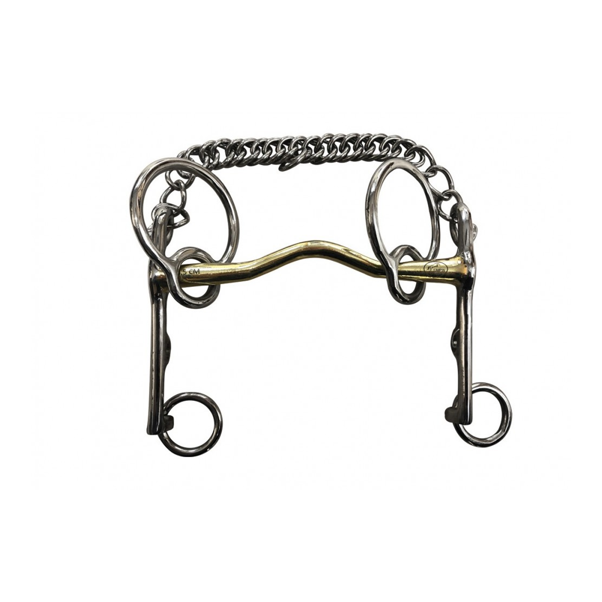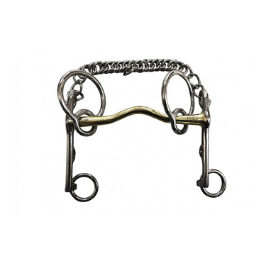 Effect: the Swales bit has some similarities with the Pelham bit but the horse doesn't feel any pressure on the neck because there is no action on the bridle cheek pieces. It is the only bit with a lever action that doesn't put any pressure on the horse's neck. It is used with a single pair of reins and a curb chain and it is less restricting than a Pelham bit as it does not have any action on the head/neck angle.