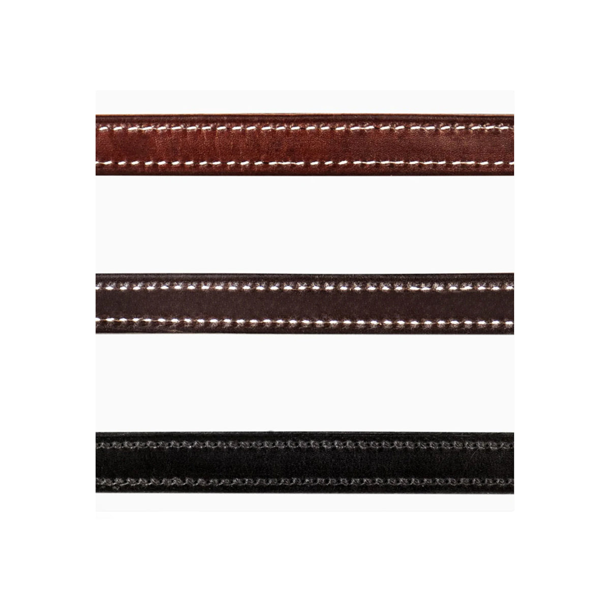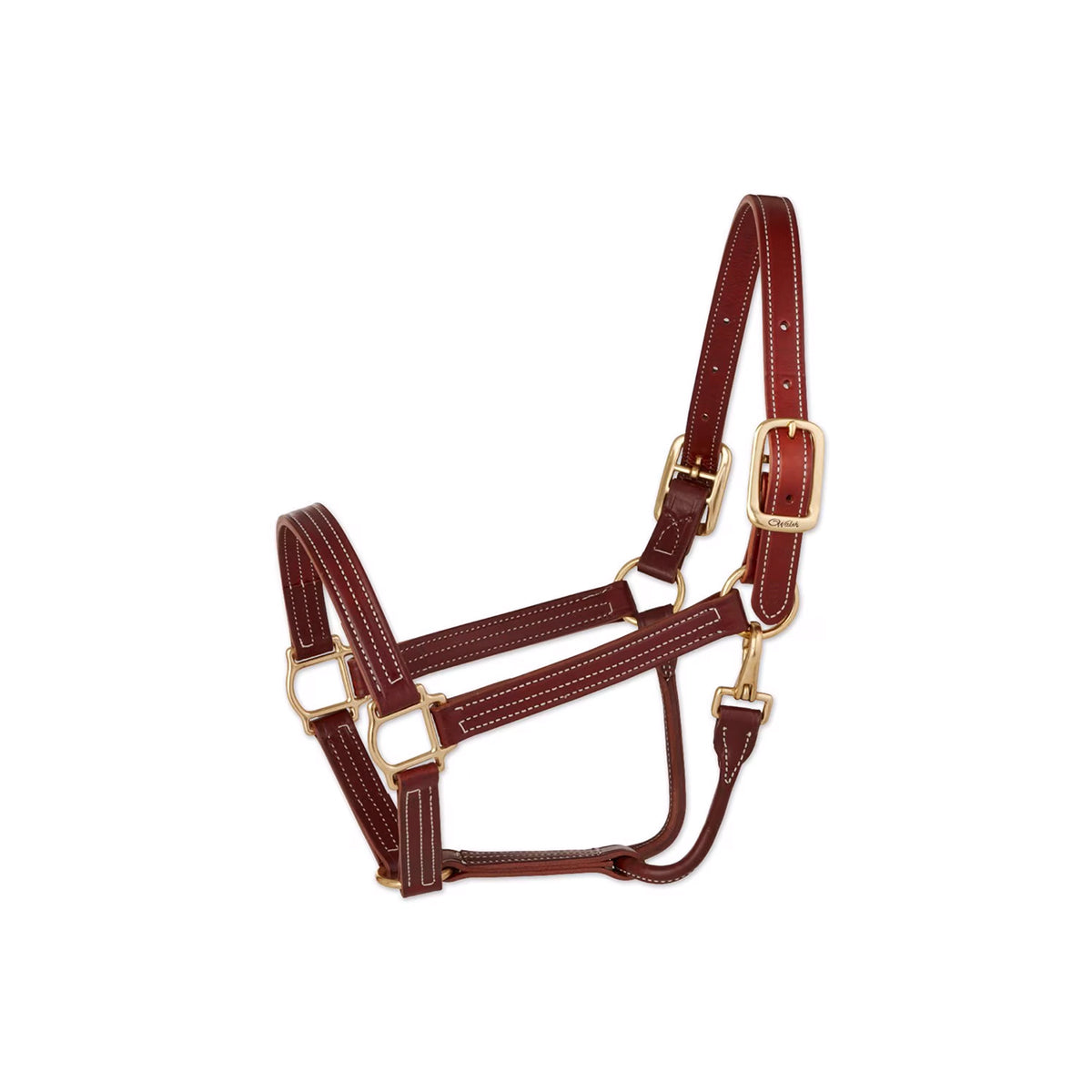 1" wide halter. Triple-stitched, two-ply construction. Hand-rubbed edges. Straight chin. Round throat. Double buckle crown. Solid brass hardware. Available in Chestnut/White thread, Black/Black thread or Havana/White thread. Sizes available: Cob, Regular Horse, Large Horse