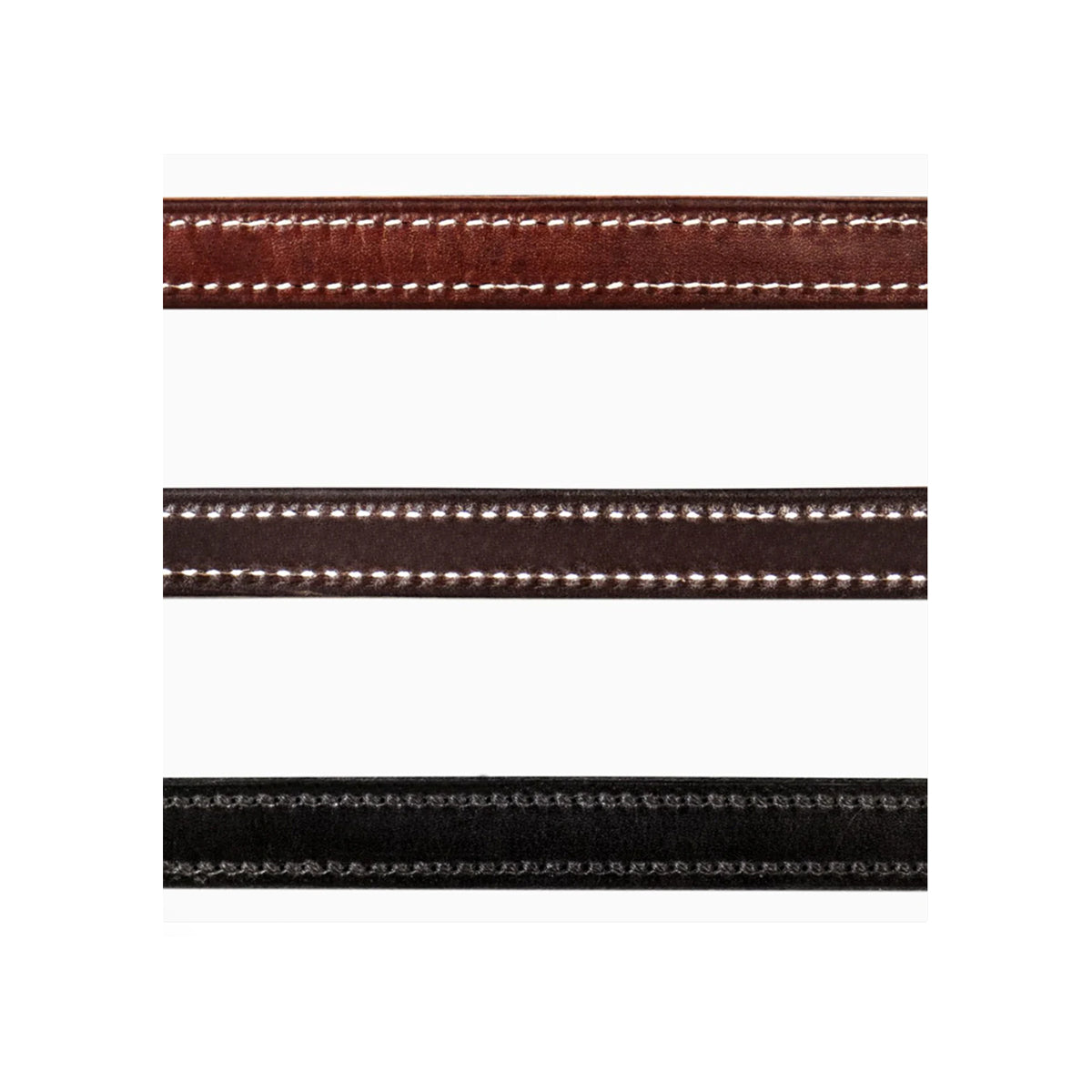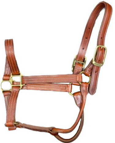 1" wide halter. Triple-stitched, two-ply construction. Hand-rubbed edges. Straight chin. Round throat. Double buckle crown. Solid brass hardware. Available in Chestnut/White thread, Black/Black thread or Havana/White thread. Sizes available: Cob, Regular Horse, Large Horse.