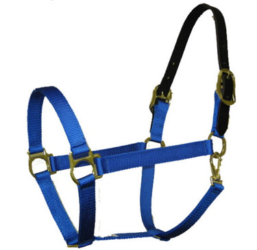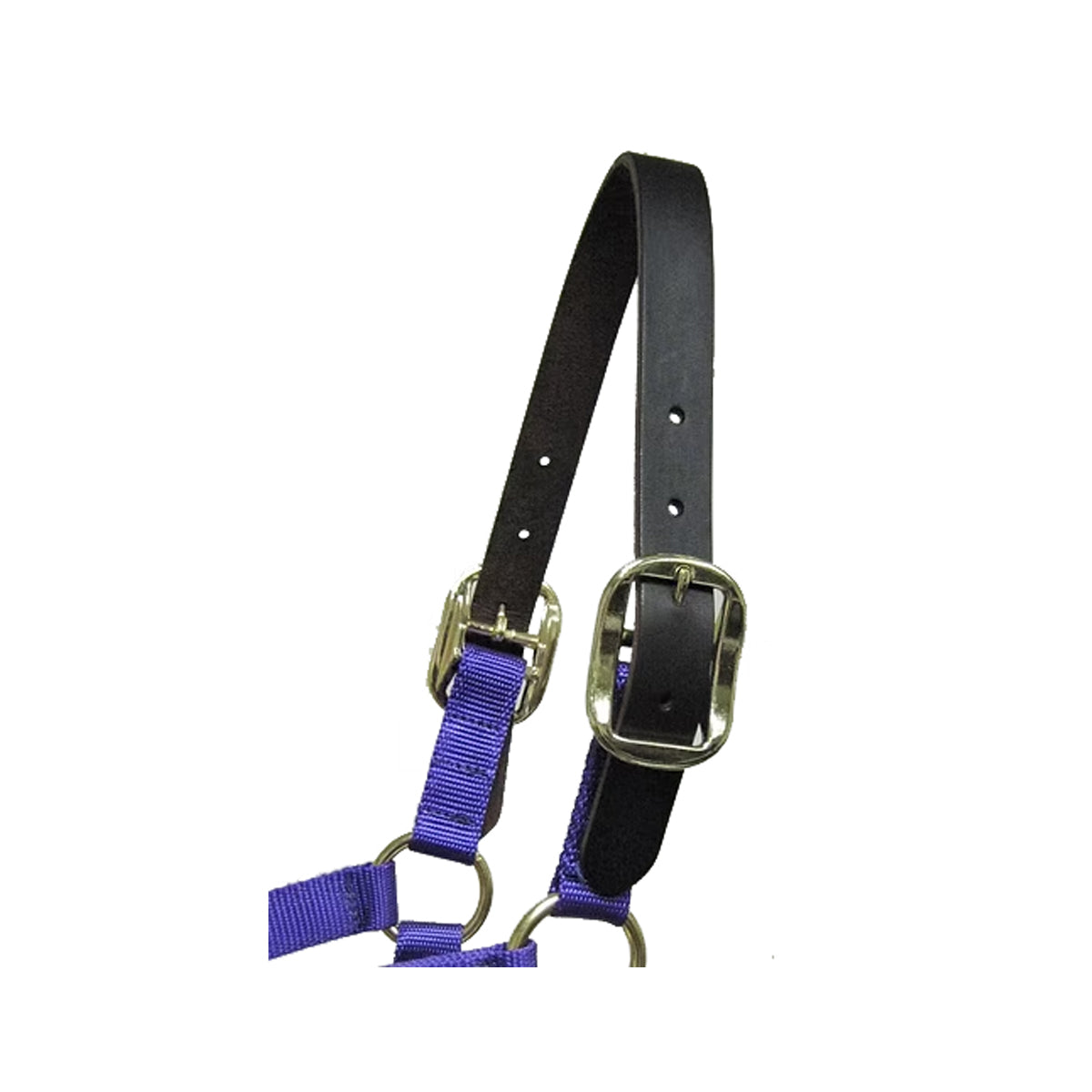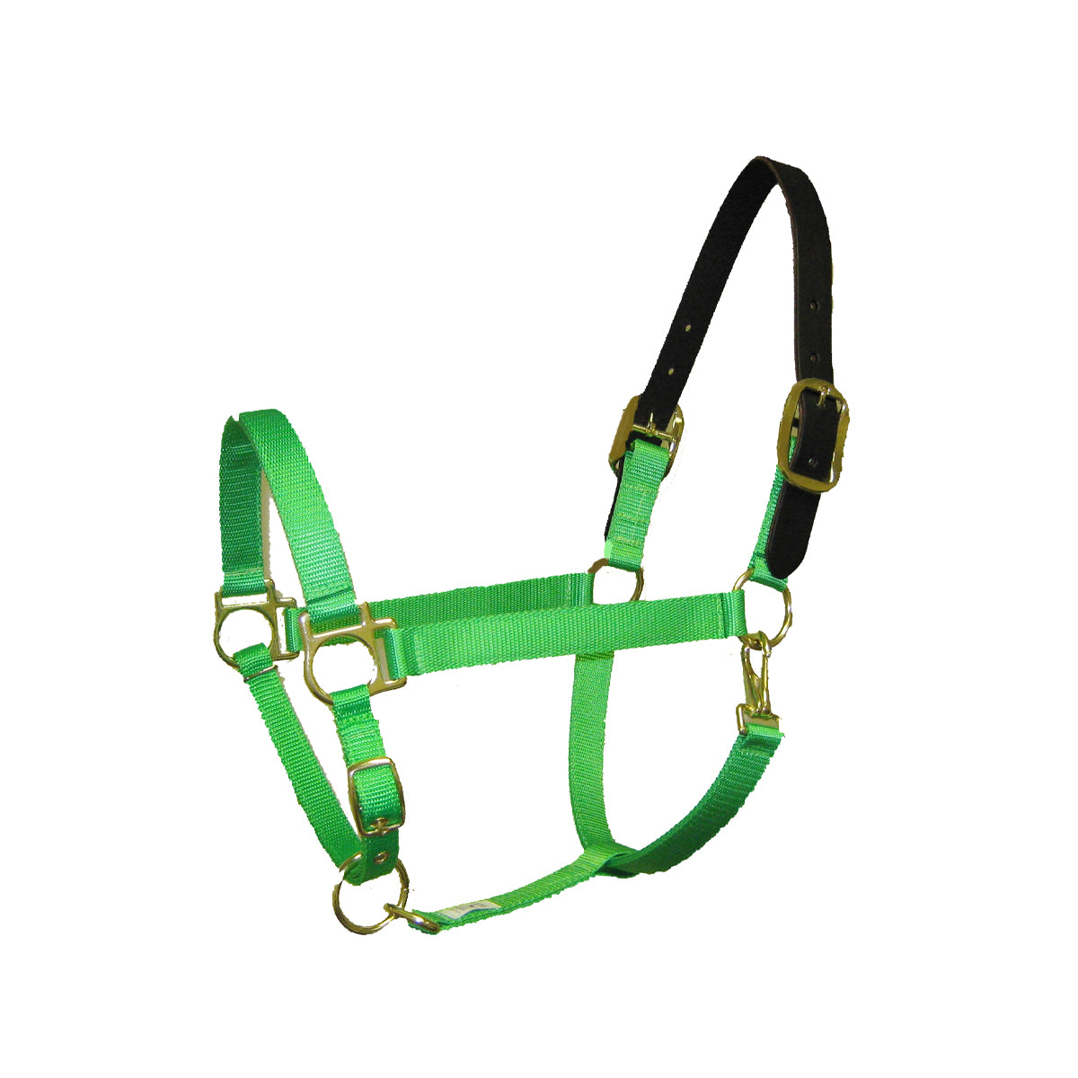 These solid color halters come with a leather crown that is designed to break under different levels of pressure. Halters are made of premium quality nylon webbing. There is five adjustments on the crown and under the nose so you can find that perfect fit. There is a snap at the throat and all hardware is brass plated. Replaceable double buckle leather crown. 3/4" wide halter. Straight chin. Throat snap. Made in the USA!