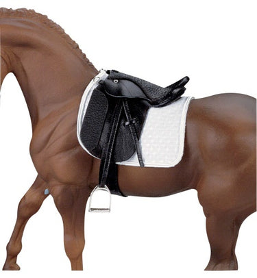 This black dressage saddle is crafted just like the real thing, with a deep seat and a quilted white saddle pad. Pair with the Dressage Bridle for a complete show set.