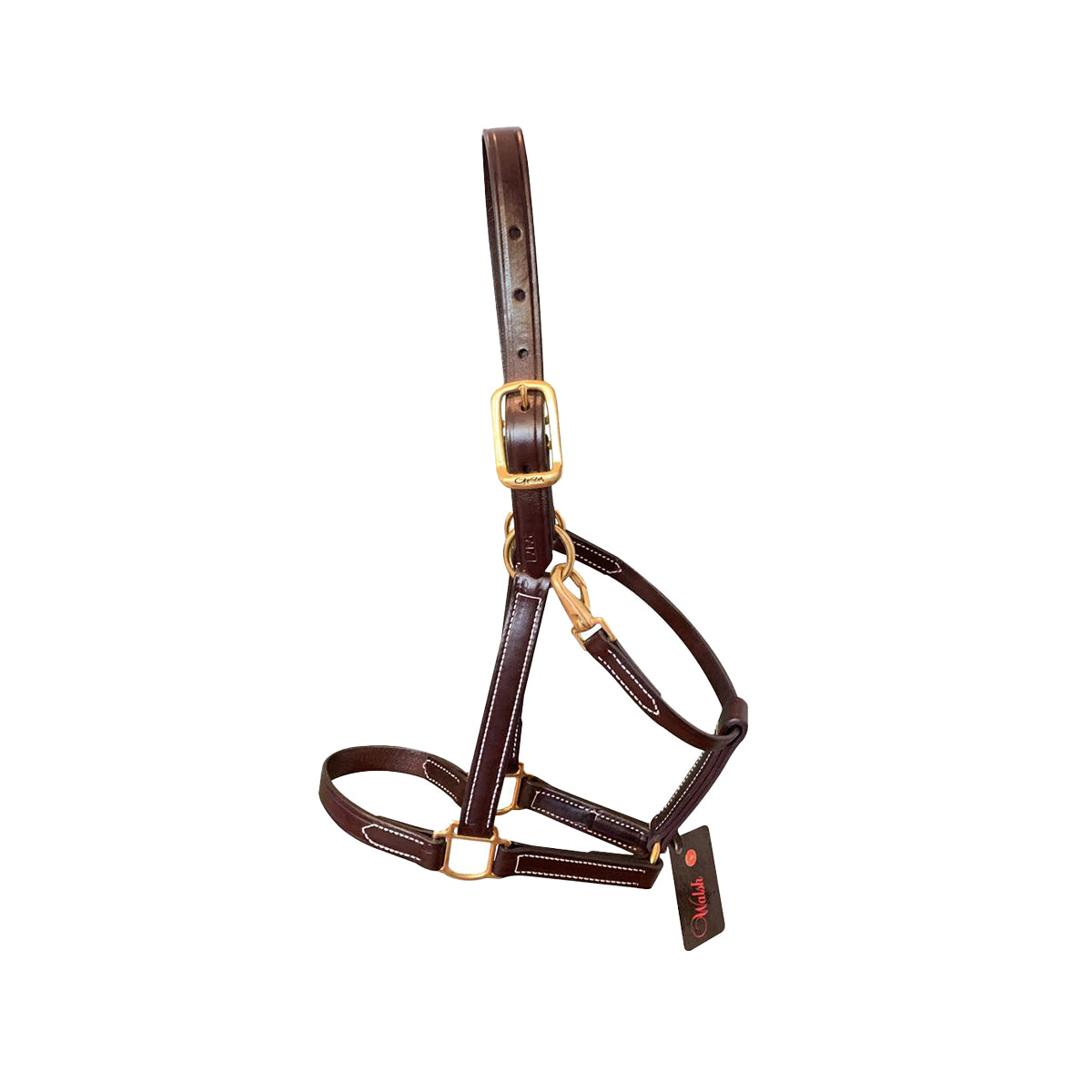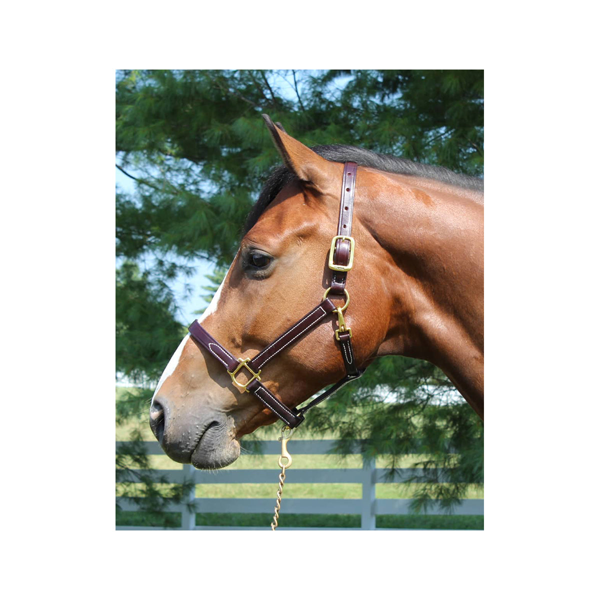 English leather bridle with double-stitched, two-ply cheeks and single-ply nose, throat, and crown. Hand-rubbed edges, straight chin, and solid brass hardware. Havana with brown thread