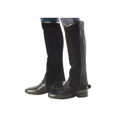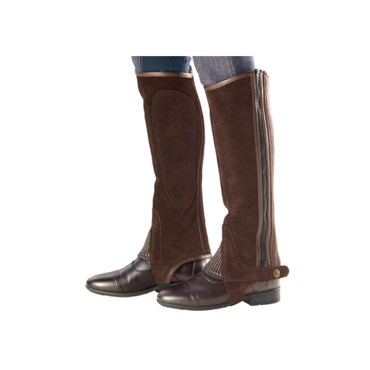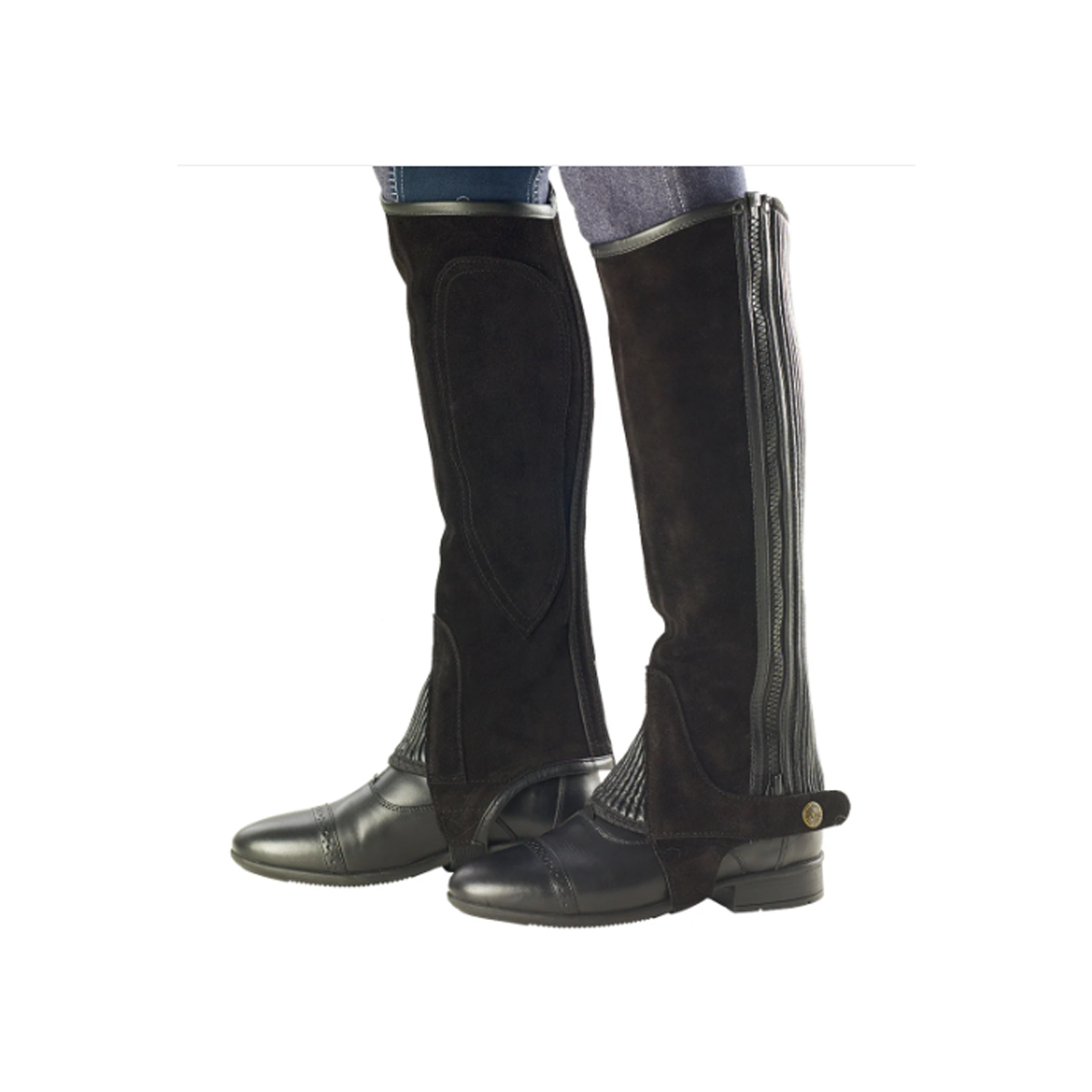 Premium suede half chaps with ribbed stretch panels and genuine YKK® flexible coil zippers.
