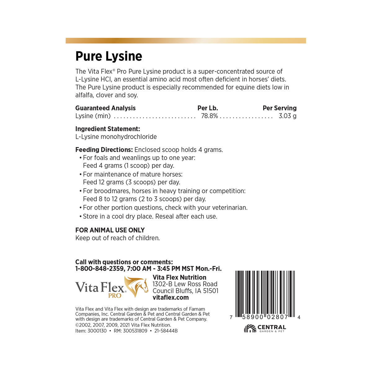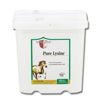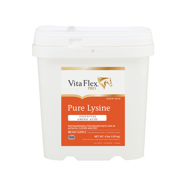 4 lb Vita Flex® Pro Pure Lysine Horse Supplement is a super-concentrated source of L-Lysine HCI, an essential amino acid most often deficient in horses' diets. Vita Flex® Pro Pure Lysine is especially recommended for equine diets low in alfalfa, clover and soy.