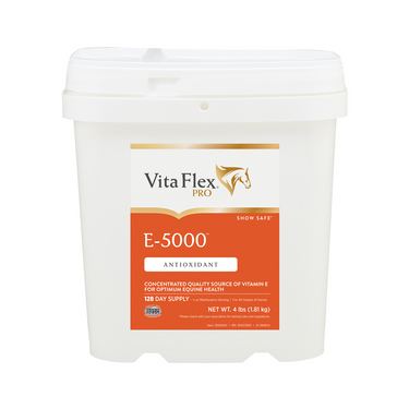4 lb Vita Flex® Pro E-5000™ is a highly concentrated source of vitamin E for optimum equine health. It is an excellent way to help provide antioxidant protection for all ages and classes of horses. Daily feeding levels can be easily adjusted to meet your horse's individual needs. This product is formulated for maximum stability and shelf life. As with any food product, please reseal to maintain freshness.