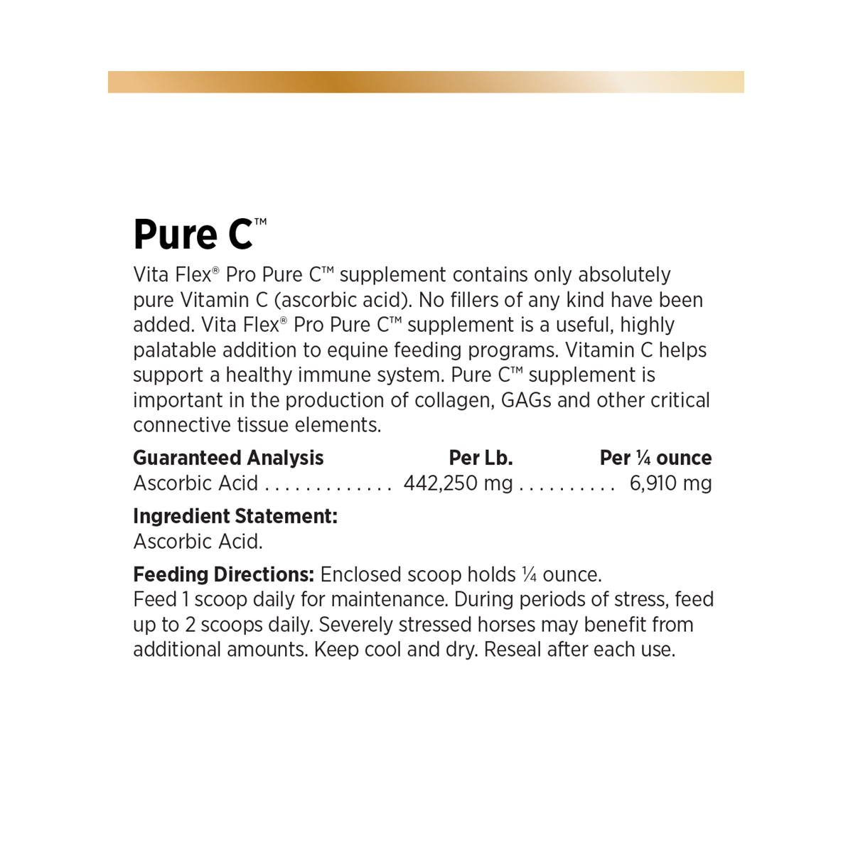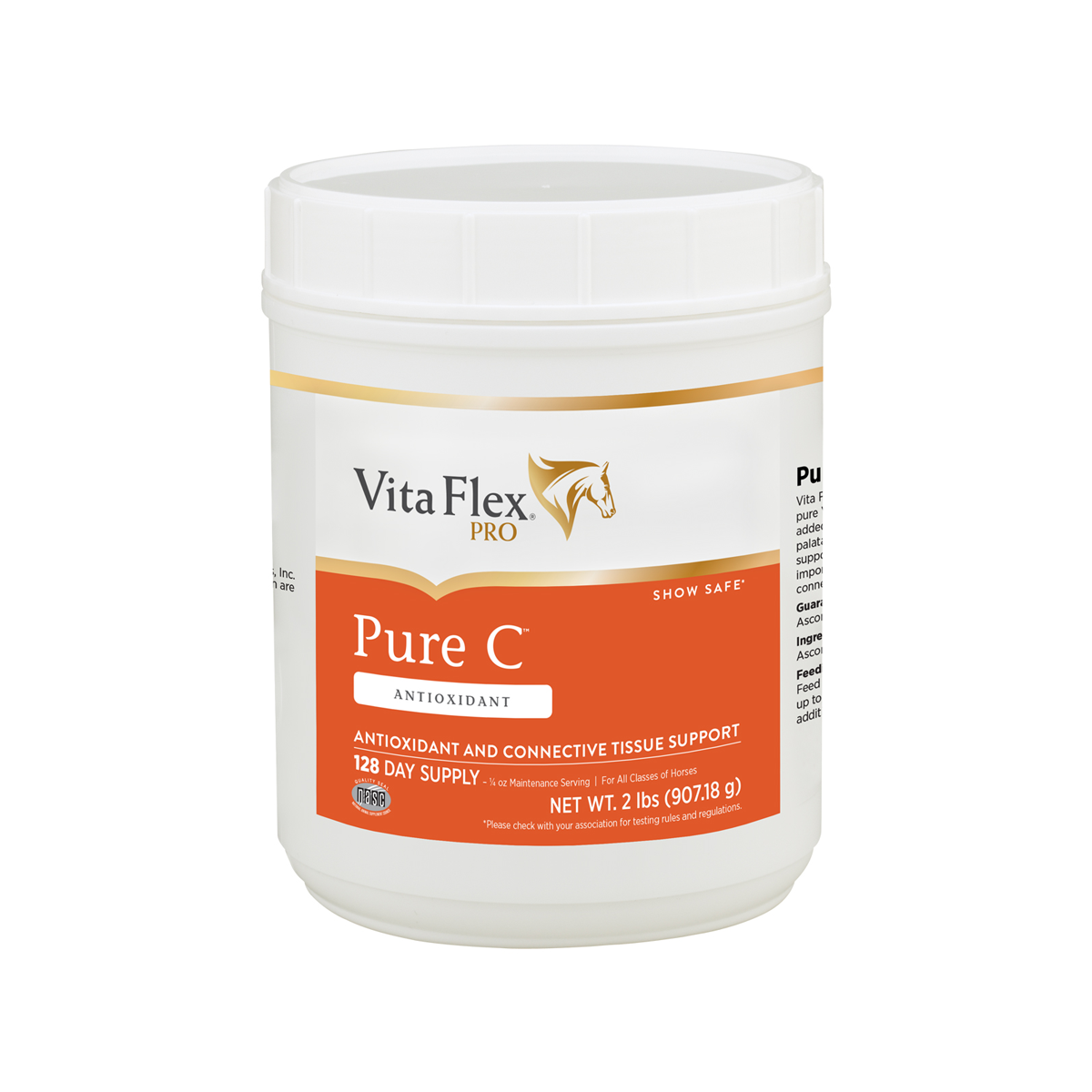 2lbs Vita Flex® Pro Pure C antioxidant contains only absolutely pure vitamin C (ascorbic acid). No fillers of any kind have been added. Pure C is not only the purest available form of vitamin C, it's also your best value. Vita Flex® Pro Pure C is a useful, highly palatable addition to equine feeding programs
