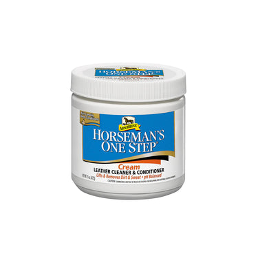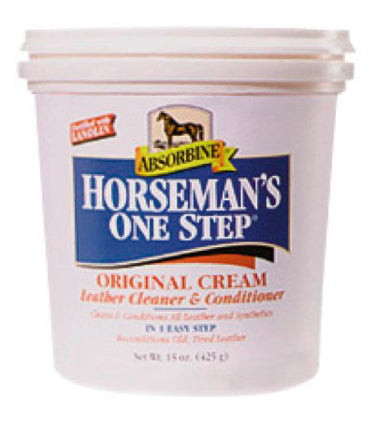Horseman's One Step is a convenient, one-step leather cleaning and conditioning cream that contains three cleaning agents. It removes dirt, sweat, and salt, while helping to restore a natural shine and protecting the leather from drying. It penetrates quickly, leaving no greasy residue and reconditions old, tired leather. Designed for the busy equestrian, it requires no water and combines cleaning and conditioning in one step. It will not darken most leathers. Not recommended for use on suede.