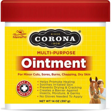 For more than 100 years, Corona Ointment has been protecting skin and helping to promote the natural healing of minor cuts, sores, burns, chapping, and dry skin. Corona Ointment has been a staple in horse wound care kits for years and works so well that no barn should be without it!Voted the horse wound care treatment of choice by Horse JournalHelps promote healing of minor woundsThick lanolin-based formula helps soothe irritated skin and prevents drying and crackingCreates an excellent barrier against insects, moisture and dirtThe thick ointment stays in place and provides continuous wound protectionUnlike other wound treatments, Corona can be safely applied with no gloves