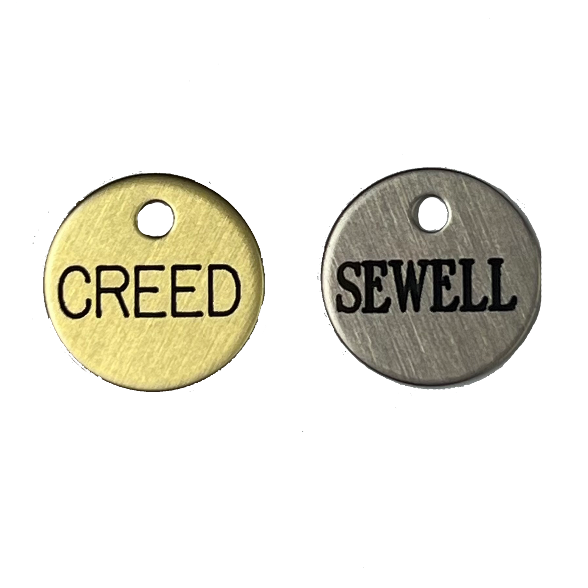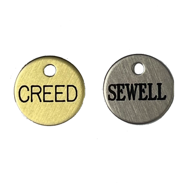 These brass or chrome discs are .75". They are perfect for dog collars, keychains and bridles tack. The plates can be engraved with up to two lines. Fonts available: Block or Roman