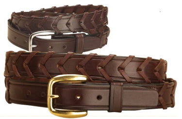 1-1/4” Creased Bridle Leather Belt with overlay lacing and the buckle attached with snaps so it can be changed if desired.