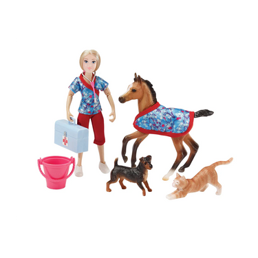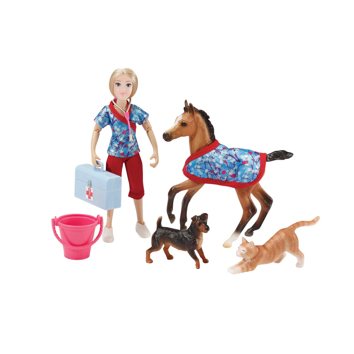 The doctor is in! Take your new foal to their first checkup at the vet, where they will meet a menagerie of new animal friends. Includes 6" articulated doll, foal, foal blanket, cat, dog, bucket, vet bag, and stethoscope.