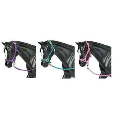 Lead your horses in style! This assortment of nylon halters and lead ropes includes three colors: purple, teal, and pink.