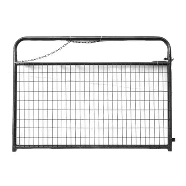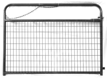Wire mesh gate. Rounded corners6 feet length (actual length is 3 inches shorter than 6 feet to allow for gate hardware and proper clearance)50 inch height1-3/4 inch diameter, high tensile tubing. Vertical pipe braces6 gauge wire mesh (2 inch by 4 inch grid pattern)Galvanized steel. Powder coated black. Includes hinges, hinge pins, and 36 inch chain