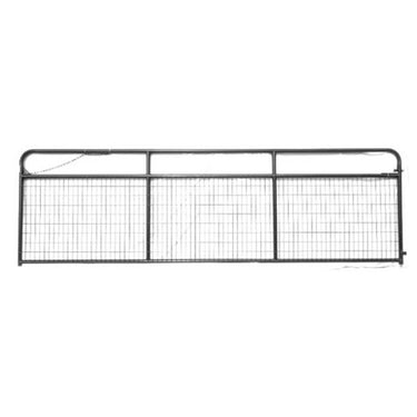 Wire mesh gate. Rounded corners14 feet length (actual length is 3 inches shorter than 14 feet to allow for gate hardware and proper clearance)50 inch height1-3/4 inch diameter, high tensile tubing. Vertical pipe braces6 gauge wire mesh (2 inch by 4 inch grid pattern)Galvanized steel. Powder coated black. Includes hinges, hinge pins, and 36 inch chain