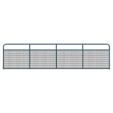 Wire mesh gate. Rounded corners16 feet length (actual length is 3 inches shorter than 16 feet to allow for gate hardware and proper clearance)50 inch height1-3/4 inch diameter, high tensile tubing. Vertical pipe braces6 gauge wire mesh (2 inch by 4 inch grid pattern)Galvanized steel. Powder coated black. Includes hinges, hinge pins, and 36 inch chain