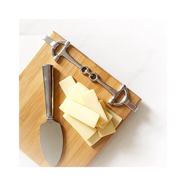 Cut up and serve cheeses with elegance using this Equestrian Bamboo Set from Arthur Court. A bit stretches along the left side of this piece, accenting the wood like the binding of a book. The handmade, aluminum cheese knife and cracker stand gleam against the sturdy bamboo, which cleans up easy.