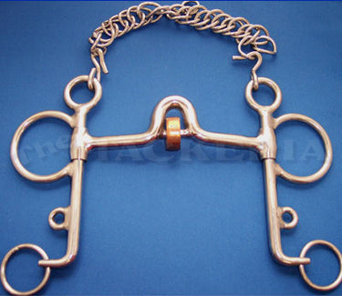 Stainless steel with copper wheel for play. Complete with curb chain. 5" mouth. Shank Sizes: 5, 6, 6 ½.