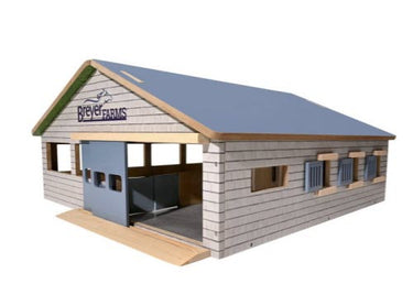 We have an exciting new wood playset in the Breyer Farms™ line - the Deluxe Arena Stable! It features removable two-sided roof panels, working doors and windows, three stalls with food trays, and a horse wash area. The inside of the roof panels are decorated to double as a beautiful grassy play area - just remove them and set them up to create the perfect spot for playing. This set includes two Stablemates horses, a Dutch Warmblood and an Irish Sport Horse, along with cardboard accessories including 12 fence pieces, six jump pieces, and two troughs. There is also a dressage letter sticker sheet, as well as a sticker sheet to personalize the stable.