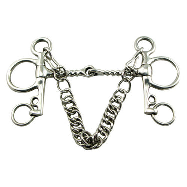 Stainless Steel Pelham bit. Features a corkscrew mouth complete with curb chain. Available in shank size 4 ½. Mouth 5.