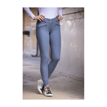 A comfortable and technical breeches for everyday use. Its close-fitting cut and mid-rise waist perfectly outline the silhouette. It features two small zippered pockets on the front and two faux pockets at the back, enhanced with a discreet row of rhinestones. The breeches have a fairly wide waistband for good support at the waist. They close with two small tabs at the front and have slim belt loops. Inside the knees, there is a grip area to secure the leg once in the saddle. The leg bottoms are made of lycra to adapt to all body shapes and leg lengths.
