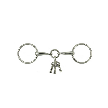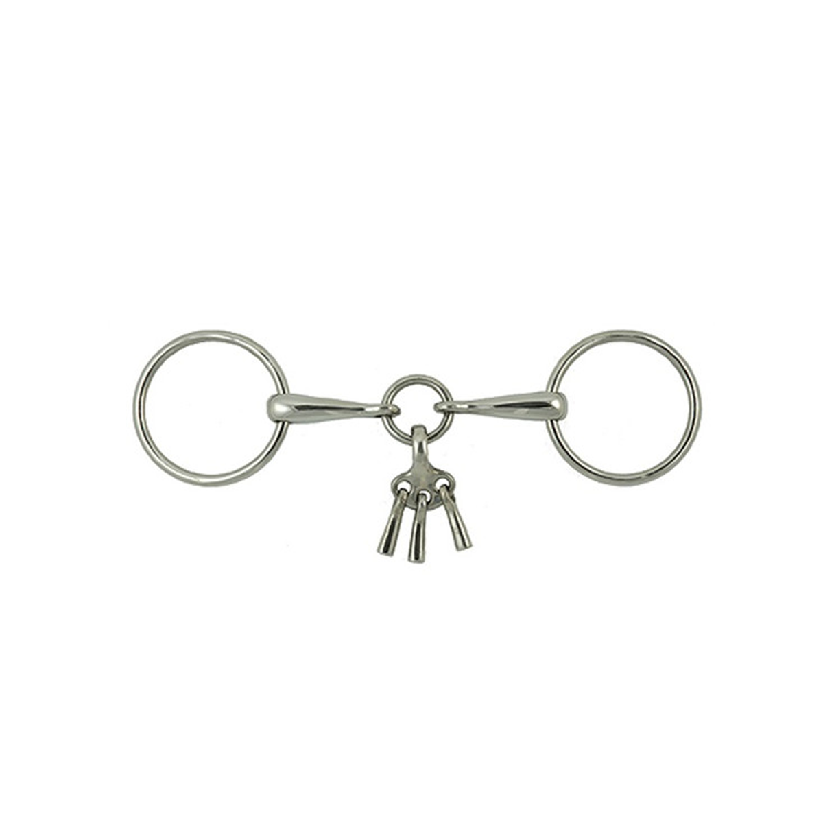 Stainless steel Player Ring Snaffle Bit with 5" double jointed mouth with attached player and 70mm rings.